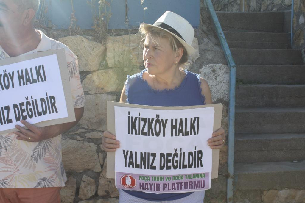 Giriş ile köy merkezi arasında oluşturulan insan zinciri sırasında “İkizköy Halkı Yalnız Değildir” “Orman Katliamına Dur De” yazılı dövizler açıldı. Foça Tarih ve Doğa Talanına Hayır Platformu Sözcüsü Ramis Sağlam okuduğu basın açıklamasında Foça halkı olarak yaşam alanlarındaki doğa katliamına karşı çıkarken, Akbelen’deki orman katliamına da sessiz kalmayacaklarını söyledi.