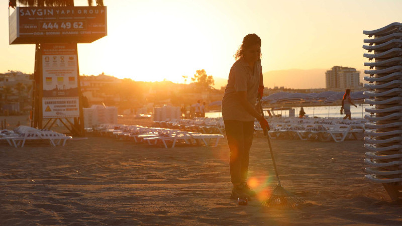 Başlayan turizm sezonu ile birlikte insan yoğunluğunun en aza indiği saatleri tercih eden ekipler, sahil üzerinde bulunan çöp teneke ve konteynırları basınçlı suyla yıkadı. Bunlarla birlikte bölgede mıntıka ve tırmıkla temizlik çalışmaları yapılırken Altınkum plajında traktörlerle kum elemesi gerçekleştirildi. Temizlik çalışması günün ilk ışıkları ile birlikte son buldu.