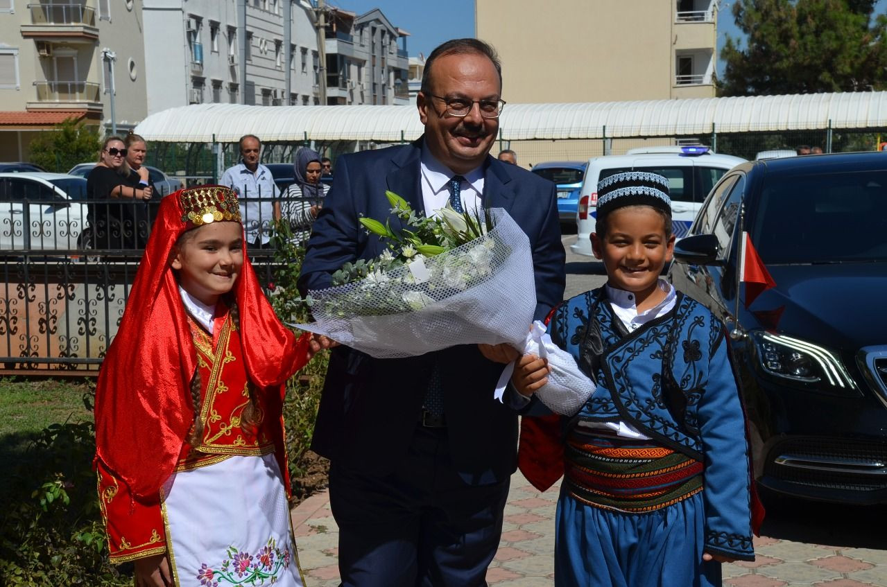 Vali Canbolat’a Didimli iki öğrenci efe kıyafetiyle karşılayarak, çiçek verdi.