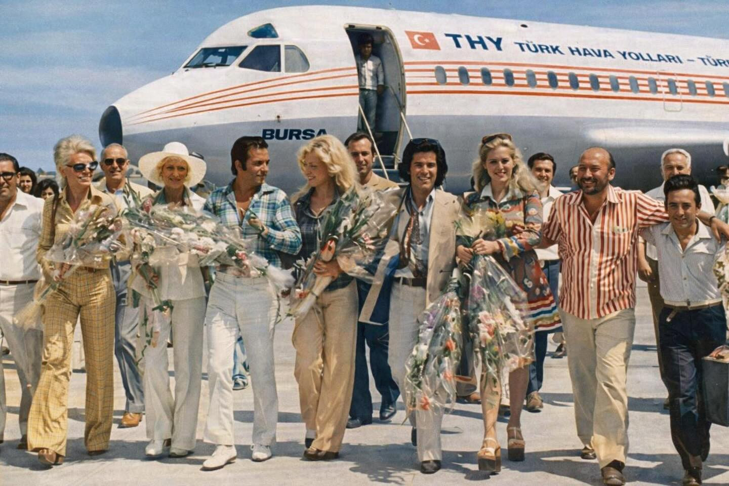 Fotoğraftaki ünlüler uçakla birlikte aynı dönemin atmosferini taşıyor — 1970’lerin görünümü, kıyafet modası, karşılama kültürü…