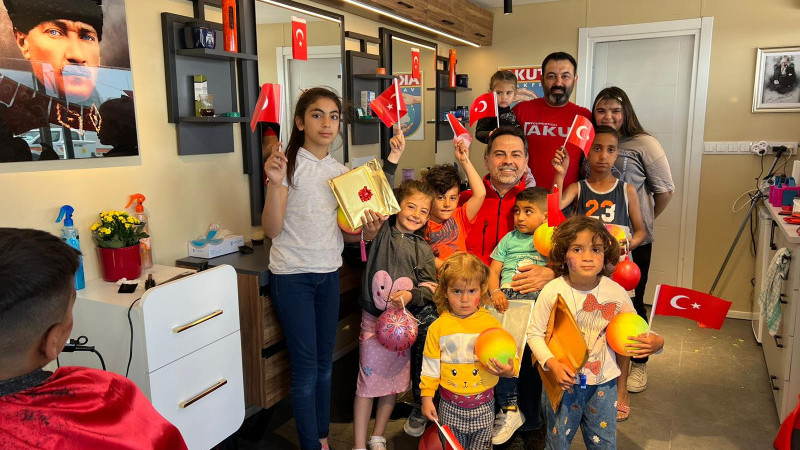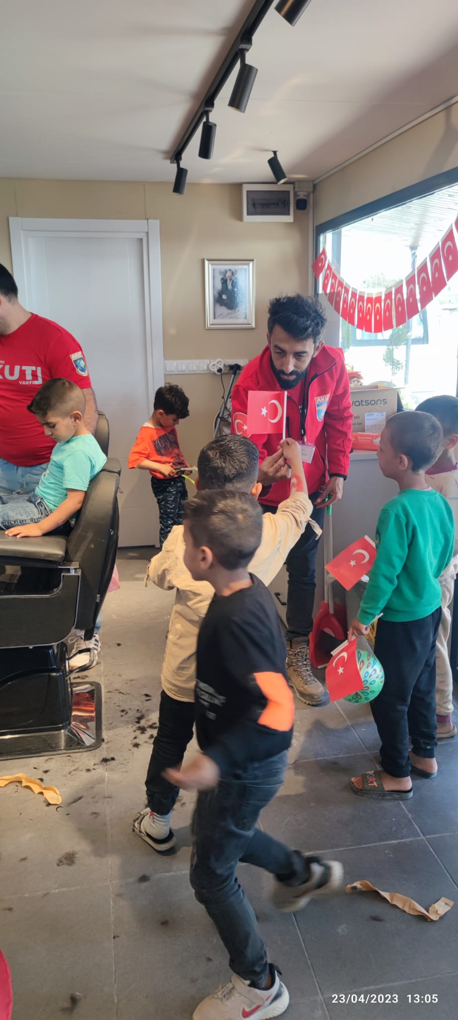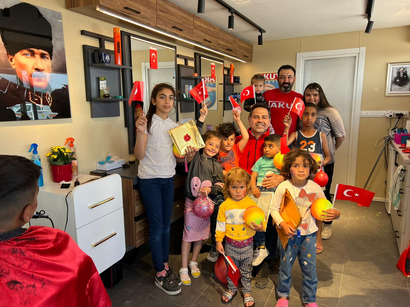 Hatay Antakya’da bayramın birinci günü kuaför/berber açan AKUT Vakfı, 23 Nisan Ulusal Egemenlik ve Çocuk Bayramı’nda sadece çocuklara hizmet verdi.