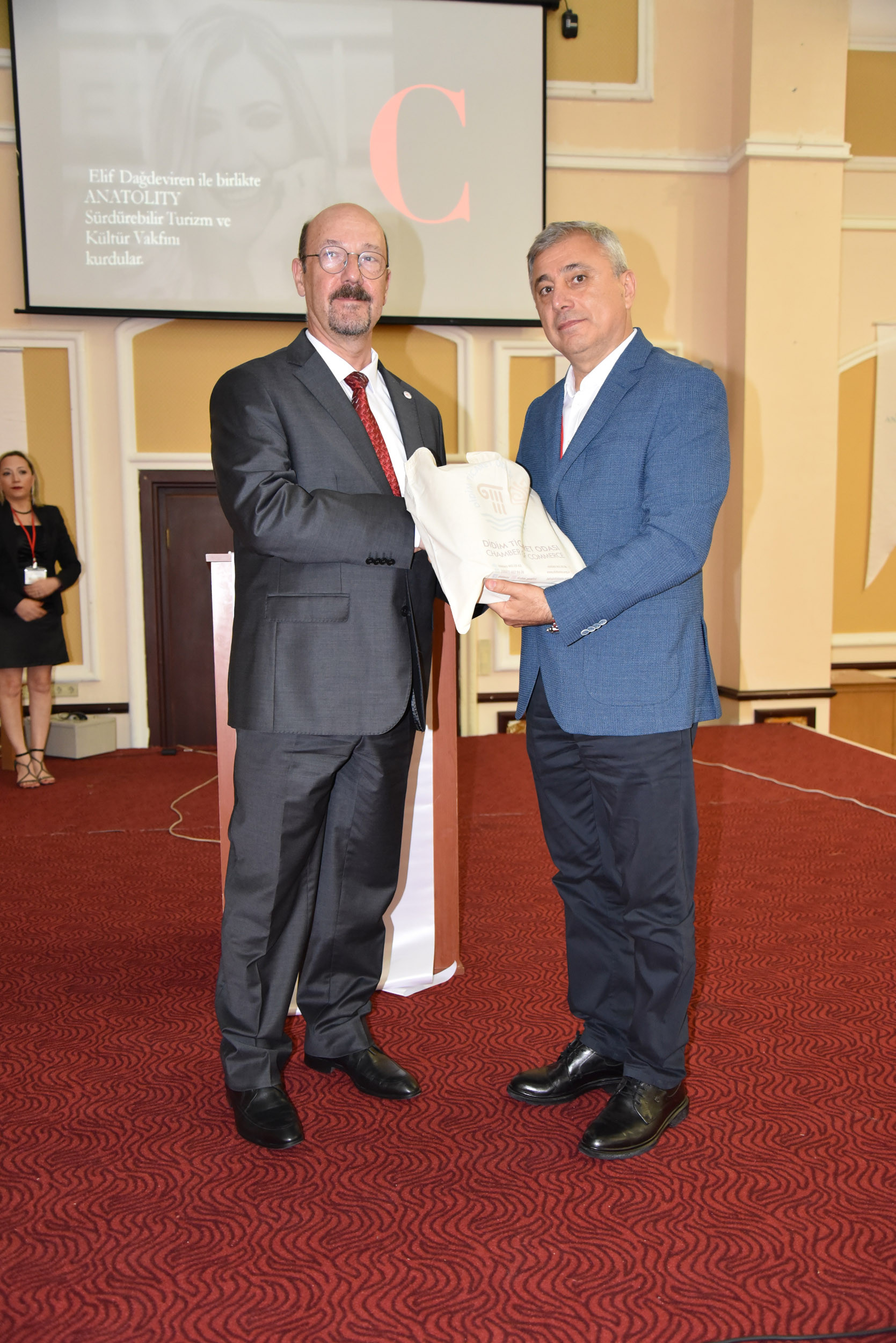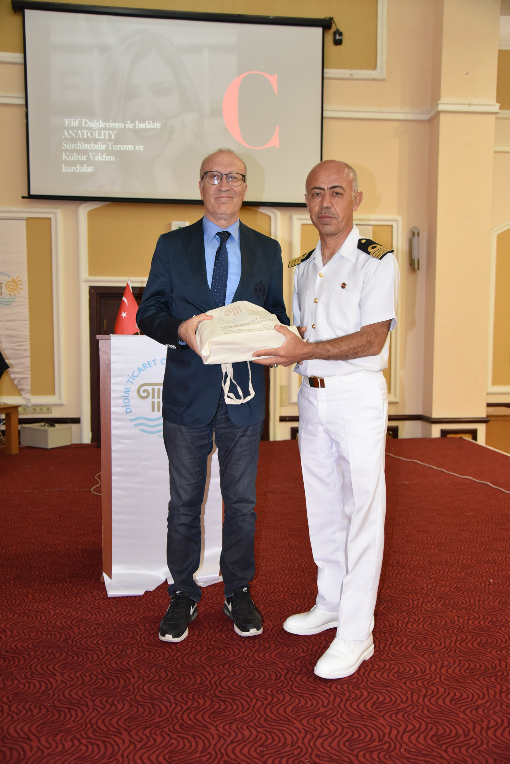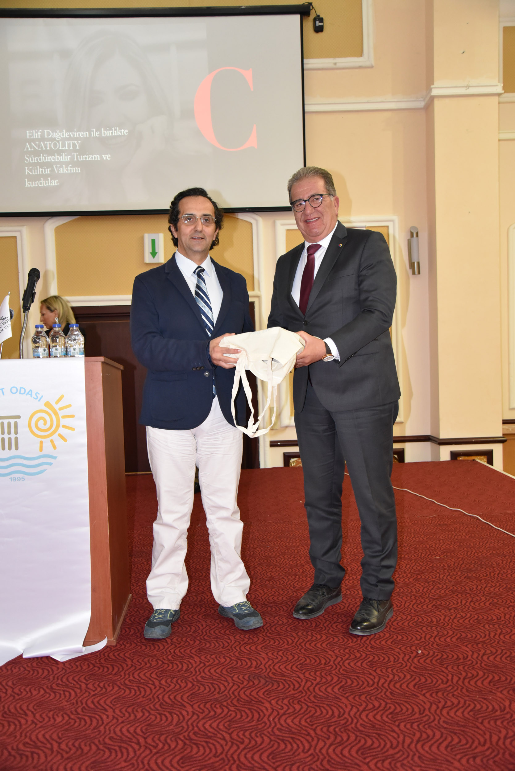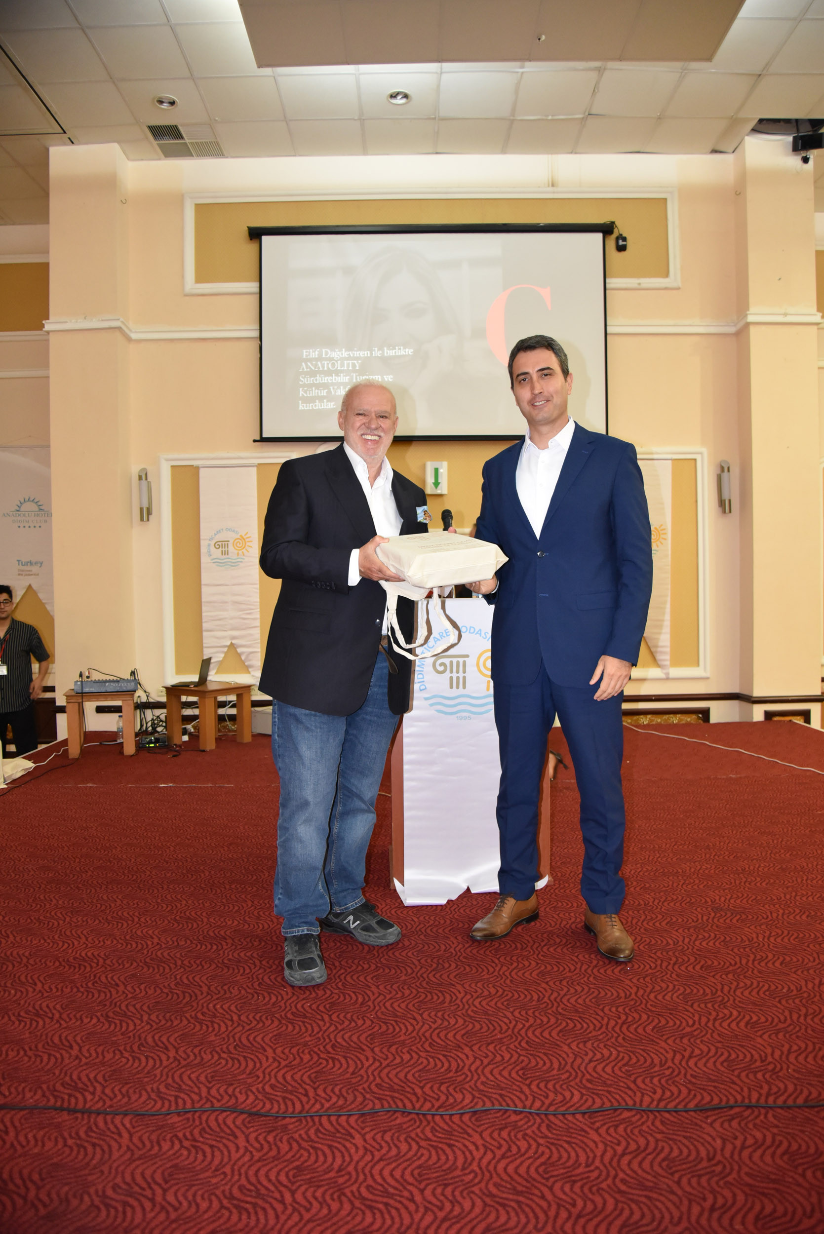 Cem Kınay ile beraber proje koordinatörü TOBB ETÜSEM Müdürü Prof. Dr. Ramazan Aktaş ve Proje Koordinatörleri Prof. Dr. Yavuz Ercil ve Dr. Türkay Kısa'ya hediye takdim edildi.