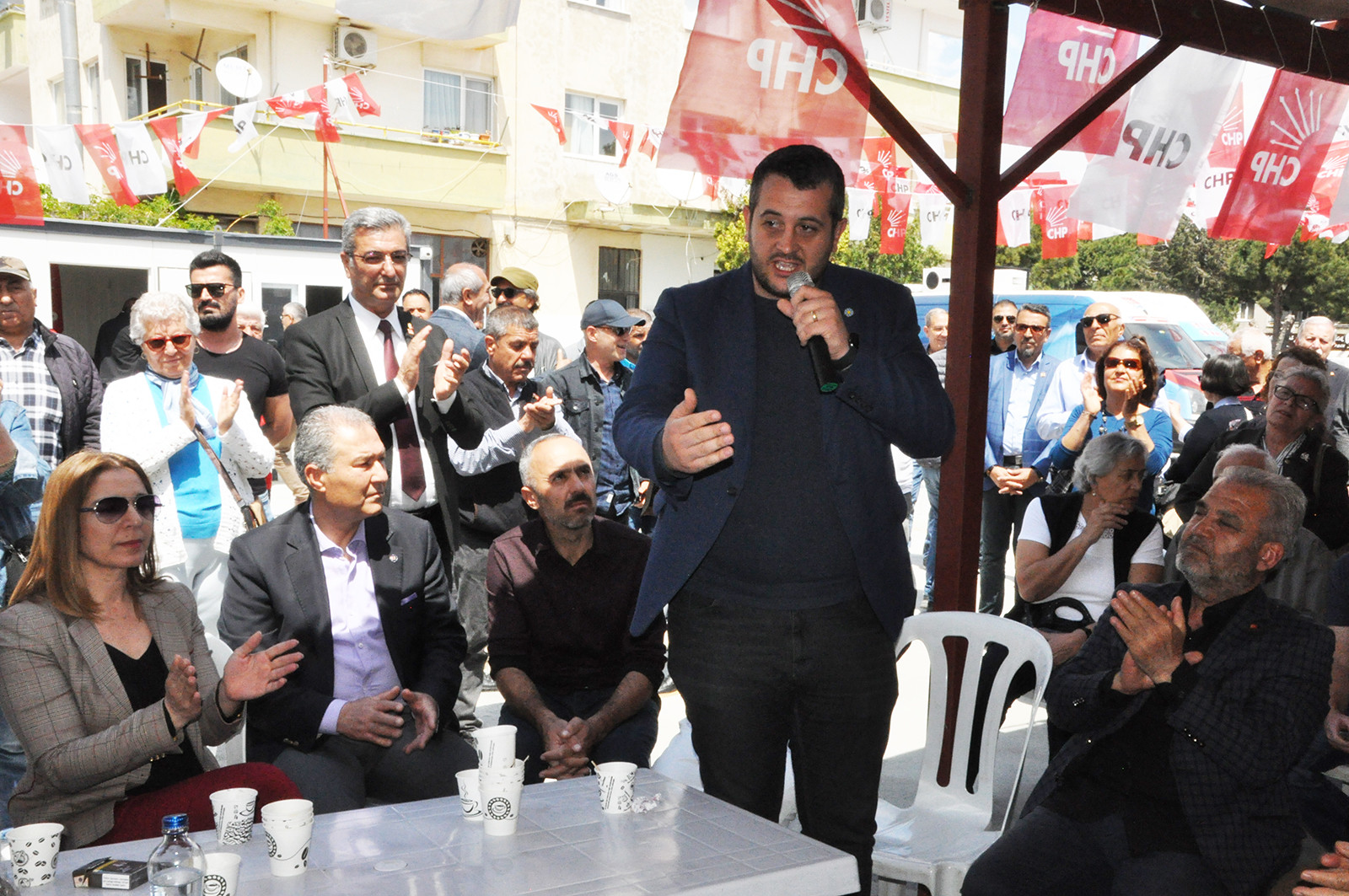 CHP İlçe Başkanı Nurettin Koçak bayram kutlamasına katılan bazı STK Başkan ve yardımcılarına da mikrofonu uzatarak bayram mesajlarını aldı.