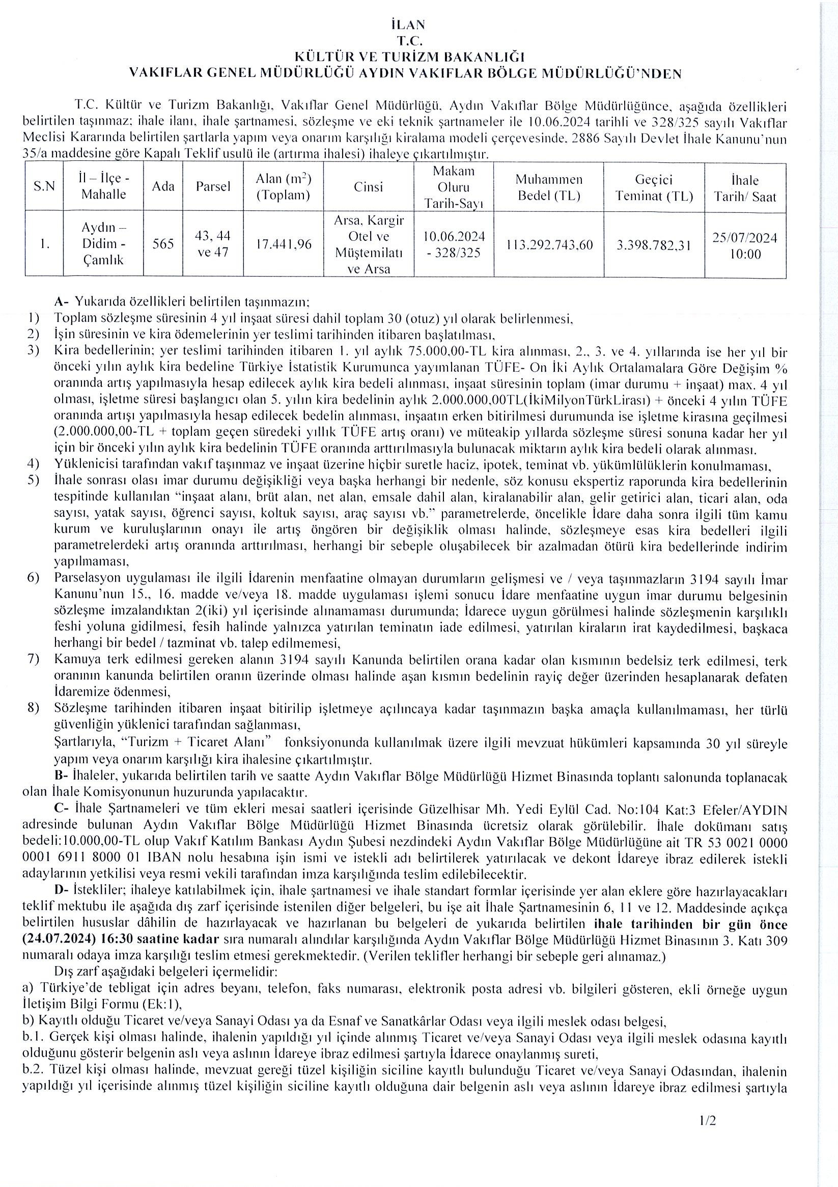 İhale yayını halen Vakıflar Genel Müdürlüğü Aydın Vakıflar Bölge Müdürlüğü'nün sayfasında yer alıyor.