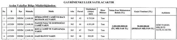 Didimlilerin yıllardır sorduğu “Ne olacak bu Vakıflar binasının hali” sorusuna yanıt sert şekilde geldi. Uzun yıllardır atıl durumda bulunan Didim’in en gözde yeri olan Altınkum plajına sıfır, deniz manzaralı Vakıflar Genel Müdürlüğüne ait tesis satışa çıkartıldı. Aydın Vakıflar Bölge Müdürlüğü, Didim Çamlık Mahallesi'ndeki(“Vakıflar Bölge Müdürlüğü)dört adet taşınmazı, 30 Aralık 2025 gerçekleştireceği ihale ile birlikte satacağını duyurdu. İhaleye katılmak isteyenlerden istenen geçici teminat bedeli ise 90 milyon lira yatırması gerekiyor. İhale, 30 Aralık Salı günü 2025’te Aydın Vakıflar Bölge Müdürlüğü’nde kapalı teklif usulü gerçekleştirileceği ve ihalenin başlangıç fiyatının ise 3 milyar TL olacağı açıklandı.