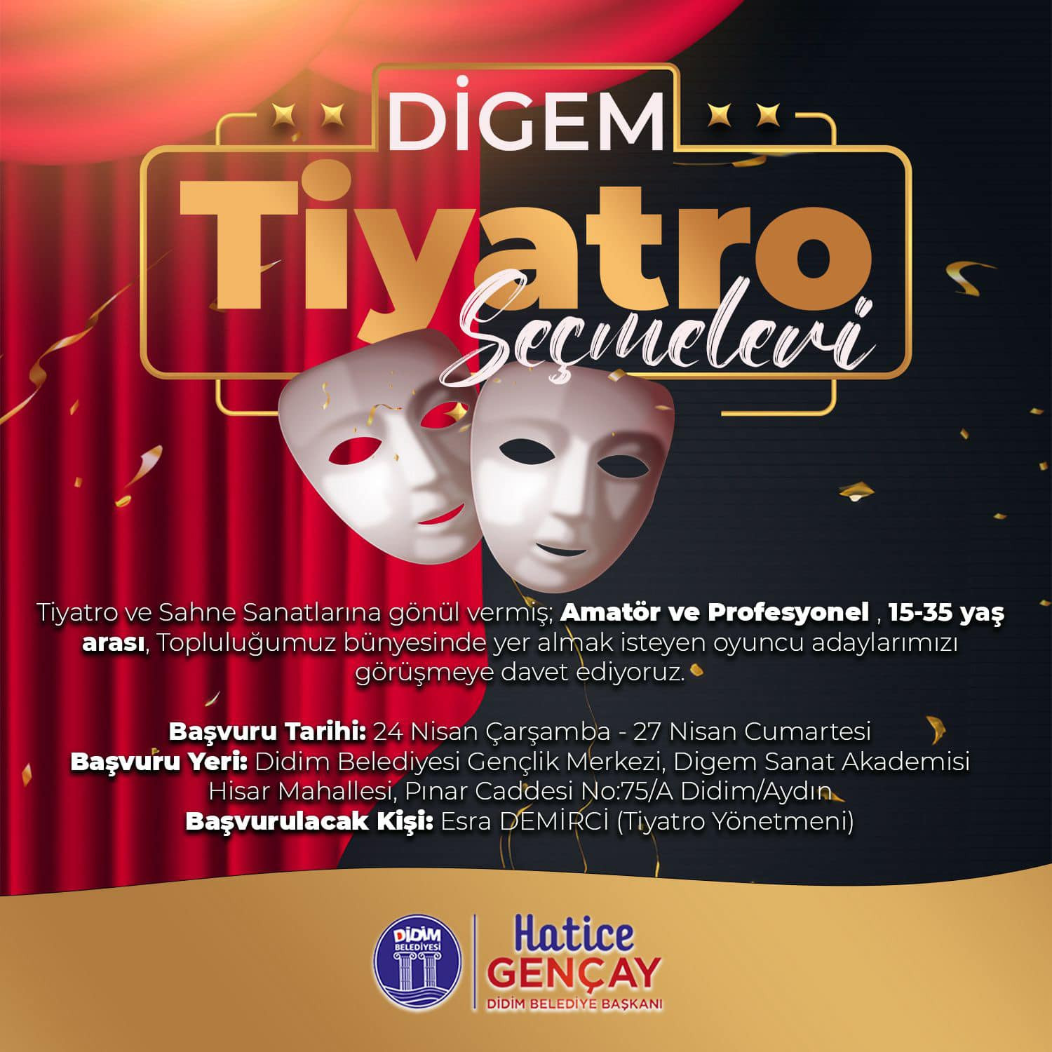 15-35 yaş arası tüm oyuncu adaylarının katılabileceği tiyatro topluluğu için başvurular, 24 Nisan Çarşamba gününden 27 Nisan Cumartesi gününe kadar Didim Belediyesi Gençlik Merkezi, DİGEM Sanat Akademisi’nde gerçekleştirilecek.