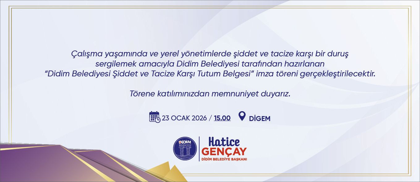 Didim Belediyesi, çalışma hayatında ve yerel yönetimlerde şiddet ve tacize karşı net ve kararlı bir duruş ortaya koyuyor. Bu kapsamda hazırlanan “Didim Belediyesi Şiddet ve Tacize Karşı Tutum Belgesi” için imza töreni düzenlenecek.
