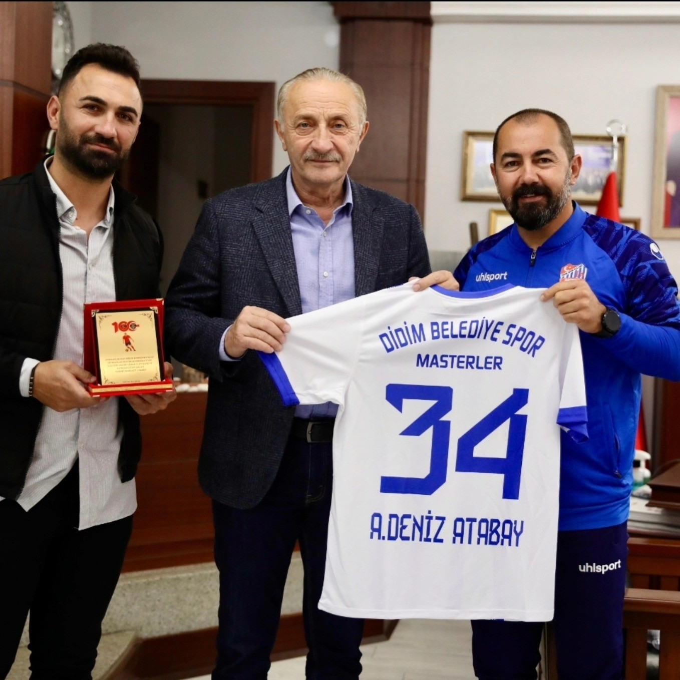 Ziyarette Didim Masterler takımı destek ve katkılarından dolayı Başkan Atabay’a forma ve teşekkür plaketi takdim etti.