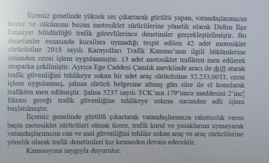 İlçemiz genelinde yüksek ses çıkartarak gürültü yapan, vatandaşlarımızın huzur ve sükûnunu bozan motosiklet sürücülerine yönelik olarak Didim İlçe Emniyet Müdürlüğü trafik görevlilerince denetimler gerçekleştirilmiştir.