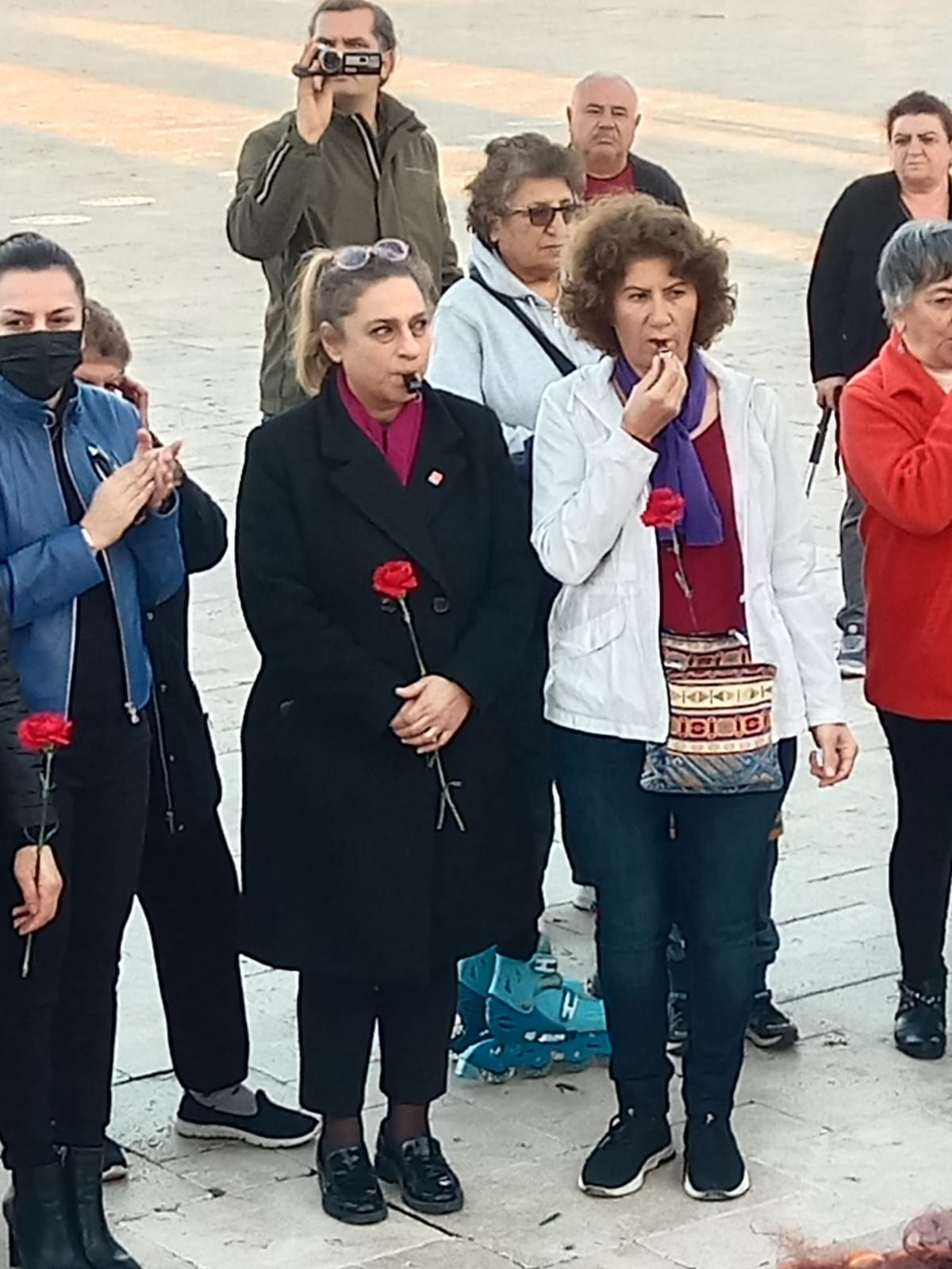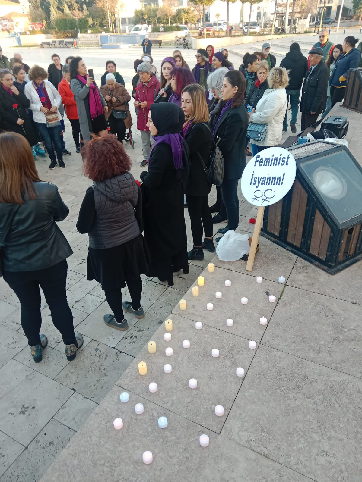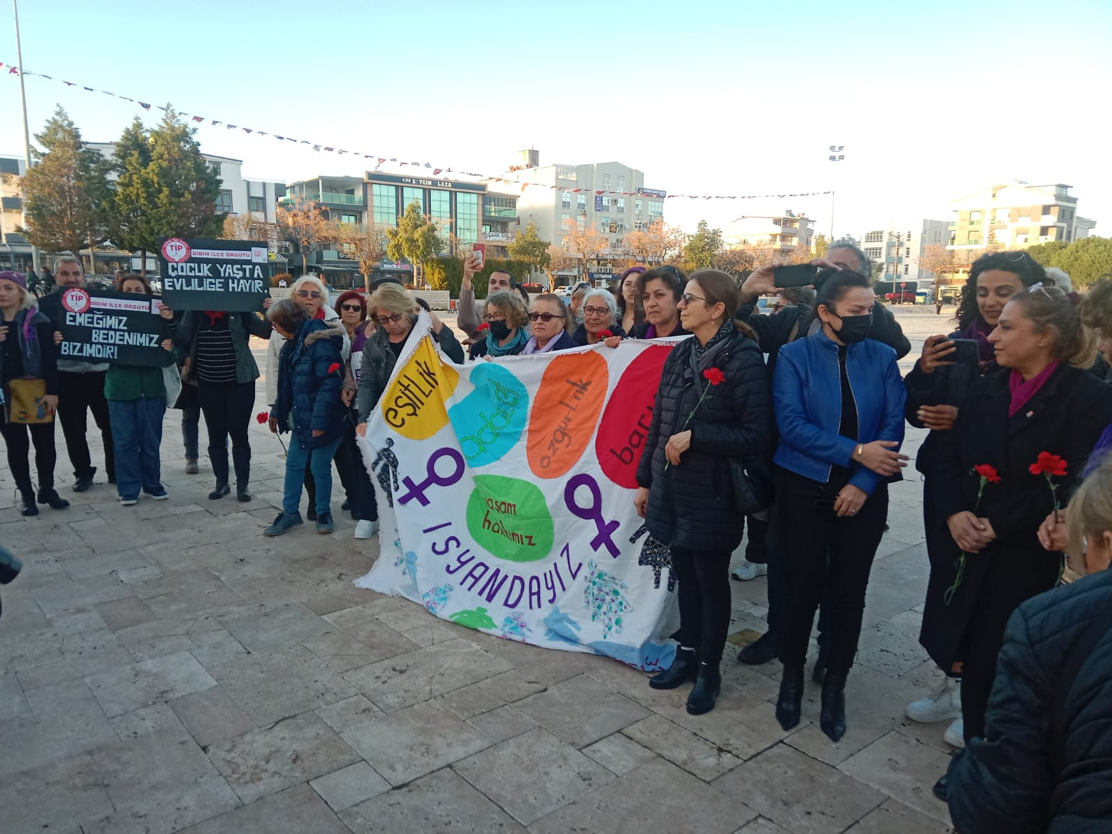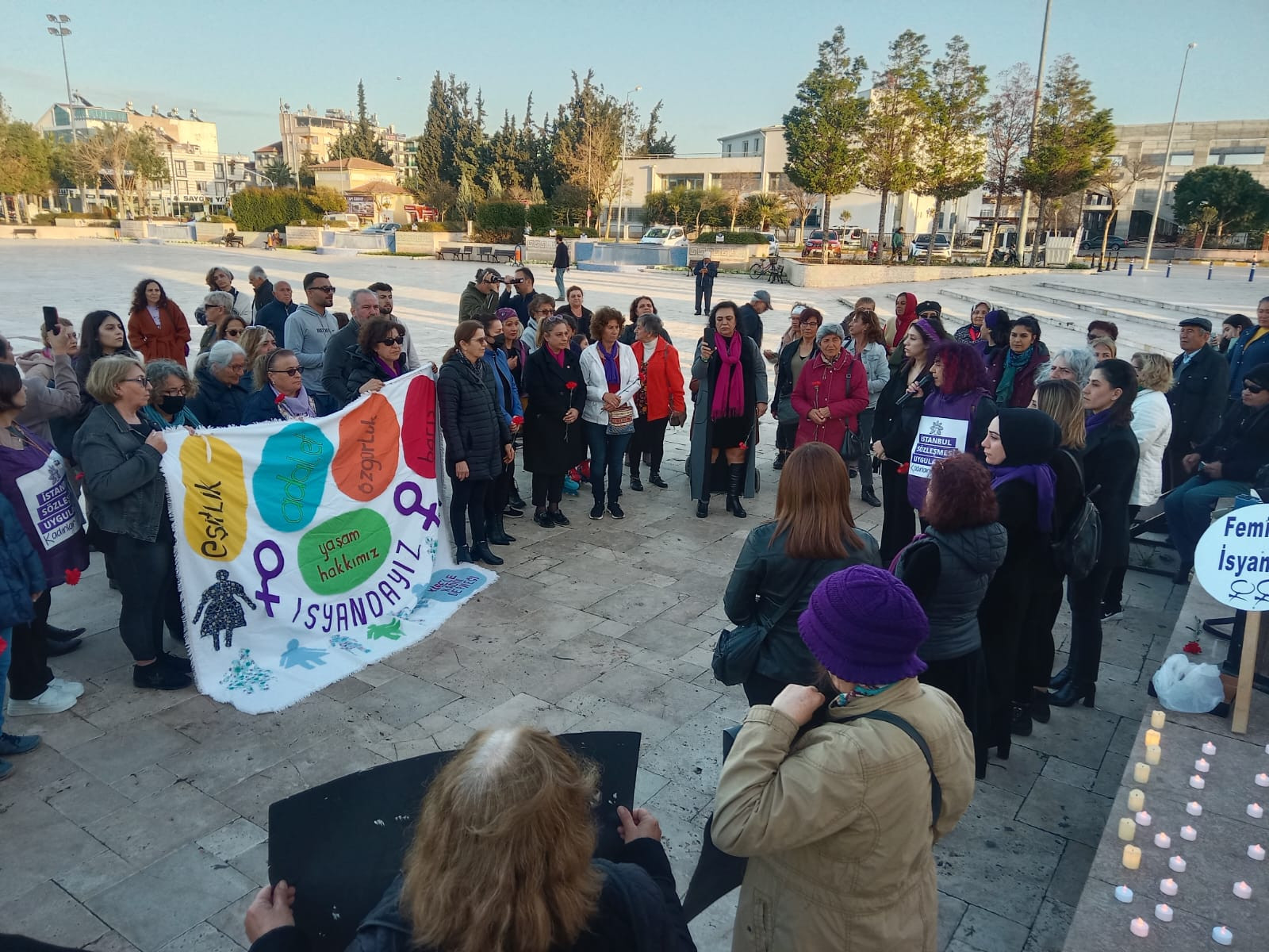 Didim Kent Meydanı'nda düzenlenen basın açıklamasına dernek üyeleri ellerinde döviz ve pankartla katıldı. Dernek adına basın açıklamasını okuyan dernek yönetim kurulu üyesi Elif Kahraman 8 Martın tarihsel sürecine değindi. Kahraman, "Sevgili kız kardeşlerim; acımız ve öfkemiz çok büyük. 6 Şubat’ta Maraş merkezli 11 kentte yıkıcı hasara neden olan depremlerde, binlerce insanımızın hayattan koparılışına tarifi olmayan bir acıyla tanıklık ettik. Yaşanılan depremin bir doğal afet olmadığını, göz göre göre katliam olduğunu biliyoruz! Deprem gibi bir felakette dahi kadınlar mağduriyeti çok daha yoğun hissetmişlerdir. Enkaz içi, enkaz çevresi ve deprem çadırında; kadınların çilesi de güvenlik ihtiyaçları da artmıştır. Bugün 8 Mart. Kadınların sevdiklerini, evlatlarını, eşlerini, yakınlarını toprağa verdiği; emeklerinin, yaşamlarının, hiçe sayıldığı bu ataerkil, kapitalist düzen yerle bir olsun diyoruz. Katliamı bize kader diye sunamaz, bu yıkımın siyasi sorumluluğunu üzerinizden atamazsınız. Toplumsal dayanışmayı baskıyla yok edemezsiniz! 8 Mart, bize asrın felaketini yaşatanlar için çöküşün ilanı olsun. Kadının, emeğin, yaşamın düzenini eşitlik ve özgürlük temelinde kuracağız."dedi.