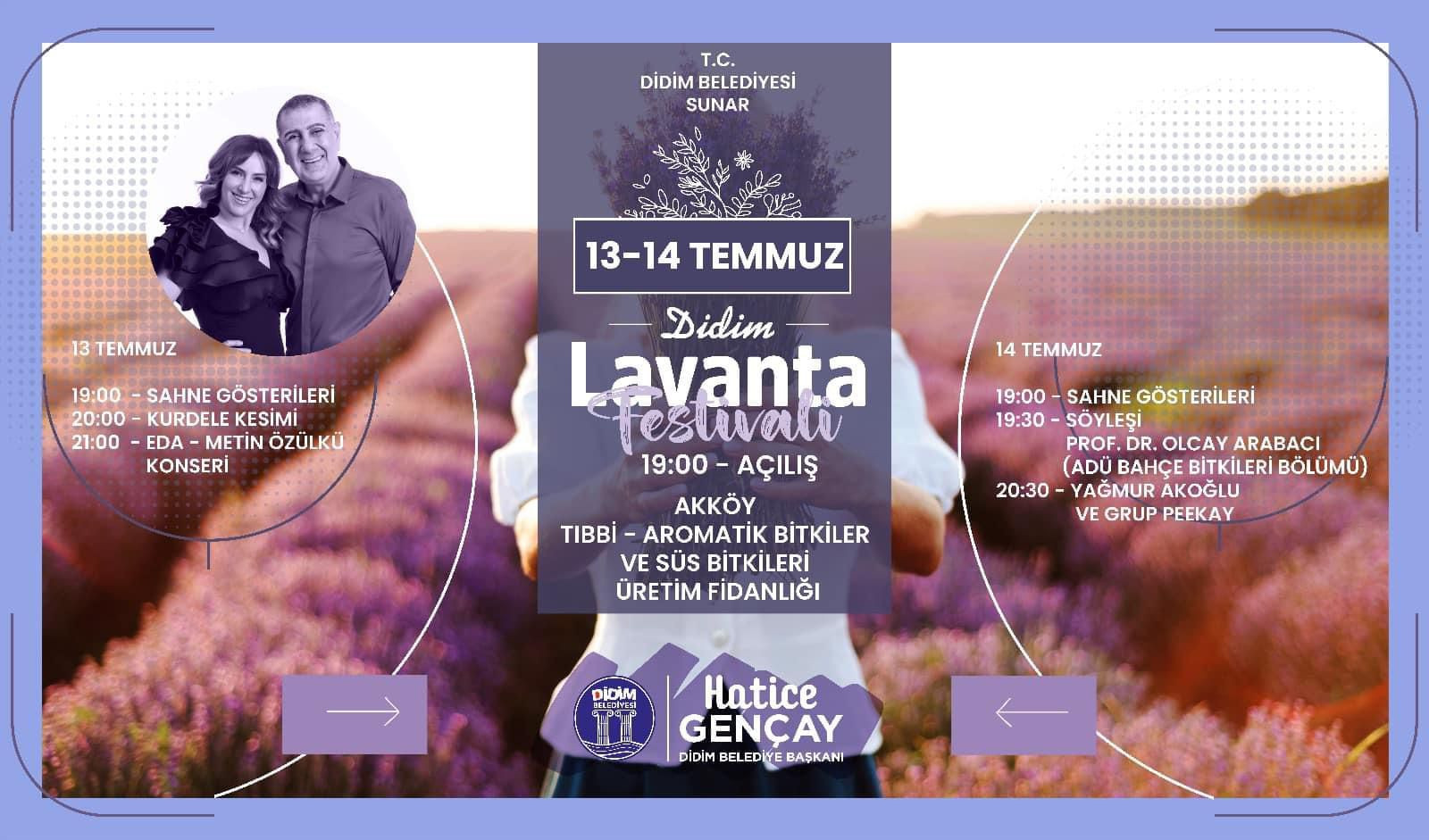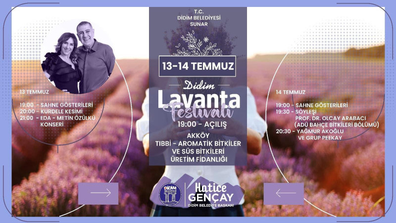Didim Belediyesi tarafından bu yıl 4.sü gerçekleştirilen Lavanta Festivali’nin ilk günü olan 13 Temmuz Cumartesi günü Saat: 21.00’de Eda ve Metin Özülkü konseri gerçekleştirilecek.