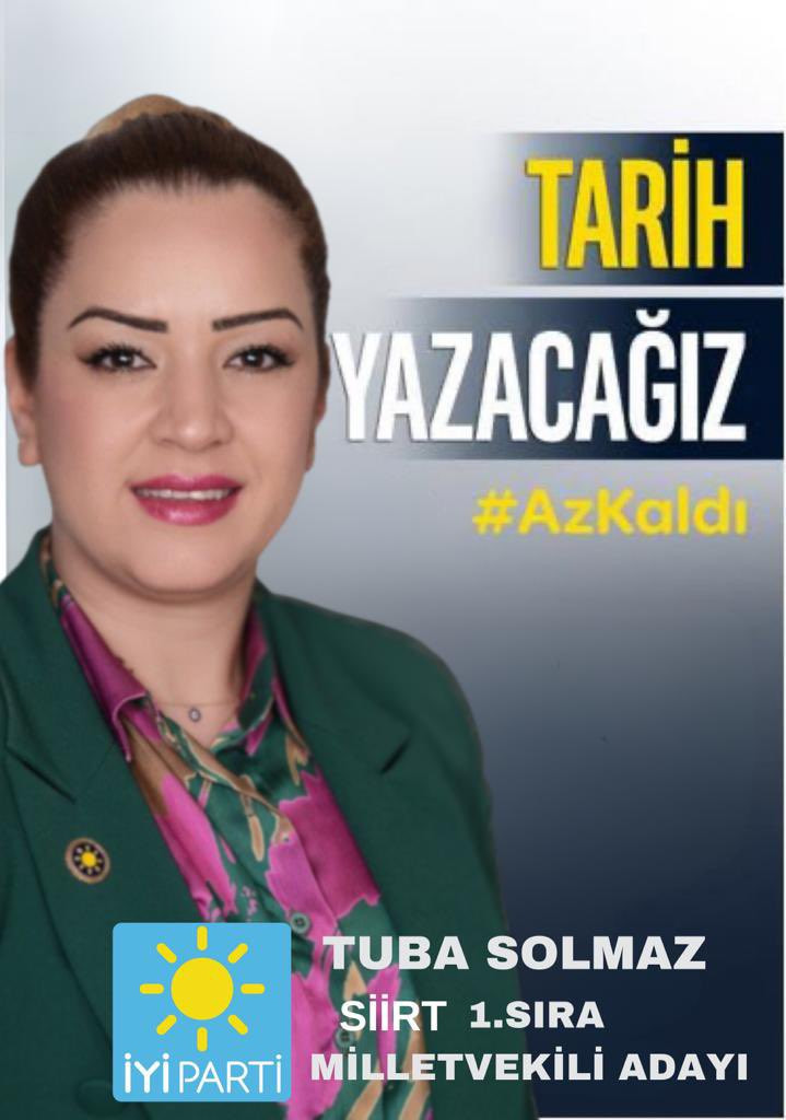 Sosyal medya hesabından açıklama yapan Tuba Solmaz ise, “Sayın Genel Başkanımız Meral Akşener’in tensipleriyle Siirt 1. Sıra Milletvekili Adayı olmaktan onur ve gurur duyuyorum. Yılmadan çalışarak partimizi birinci parti yaparak Siirt’imizin geleceği için çalışmaya ant içtik. Rabbim bu yolda bizi muvaffak eylesin” ifadelerini kullandı.
