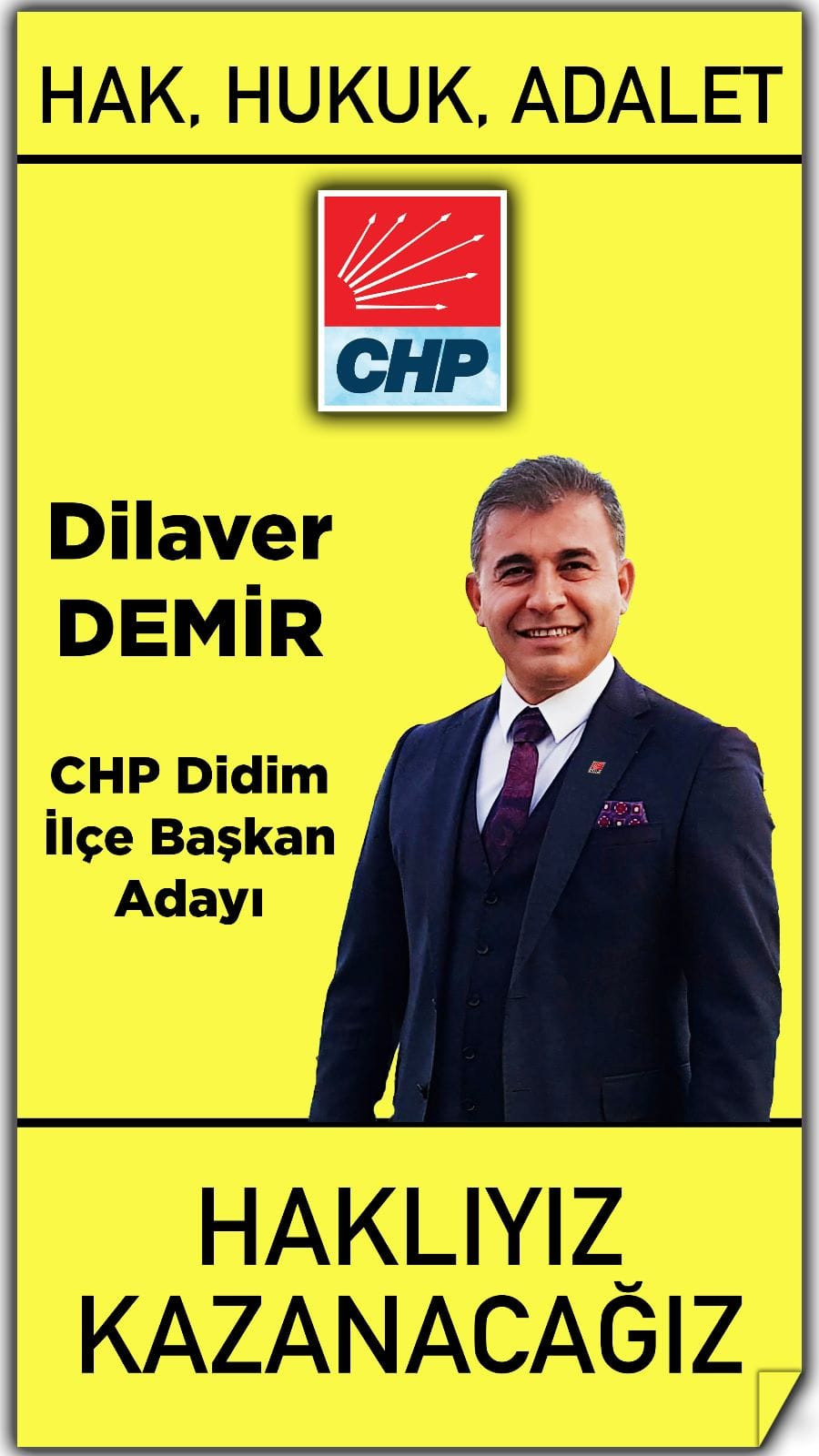 Dilaver Demir CHP Didim İlçe Başkanlığı'na adaylığını açıkladı. 15 Temmuz'da yapılan delege seçimlerinde Mavi Liste'nin gençlik ve cinsiyet kotasına uymadığı gerekçesiyle yaptığı itiraz CHP Genel Merkezi tarafından kabul edilen Dilaver Demir (Sarı Liste) 12 Ağustos'ta yapılacak olan seçimde CHP Didim İlçe Başkanlığı'na adaylığını açıkladı.