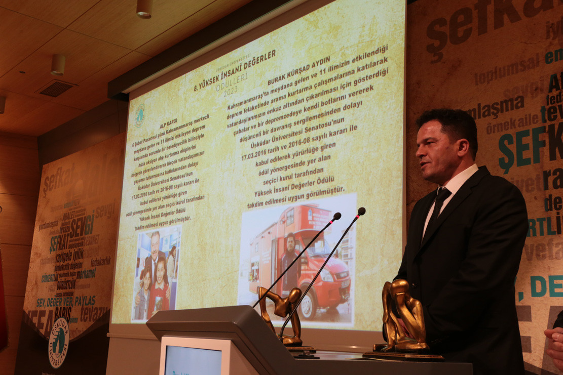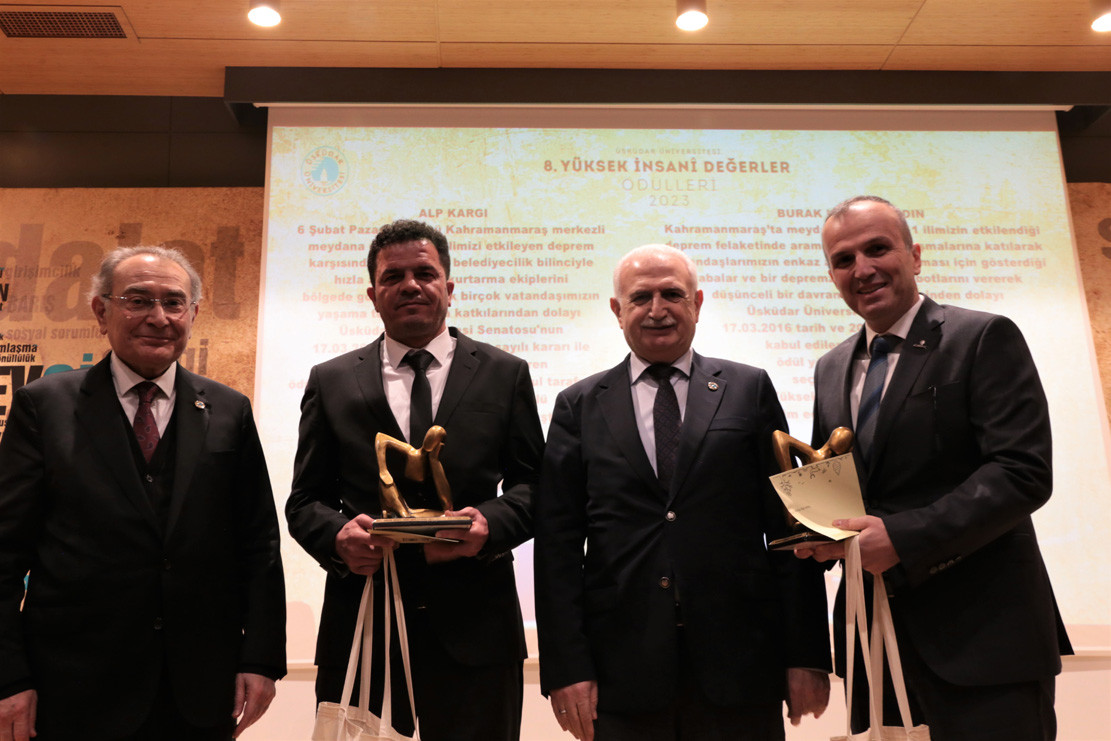 Üsküdar Üniversitesi 8. Yüksek İnsani Değerler Ödülü’ne sosyal ve yardımsever belediyecilik anlayışı ile ön plana çıkan Merzifon Belediye Başkanı Alp Kargı ile Kahramanmaraş merkezli deprem felaketinde 6 saat boyunca çalışıp enkaz altından yalın ayak çıkardıkları vatandaşımıza üşümemesi için kendi botlarını vererek gönülleri kazanan İtfaiye Eri Burak Kürşat Aydın oldu.