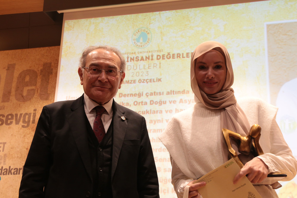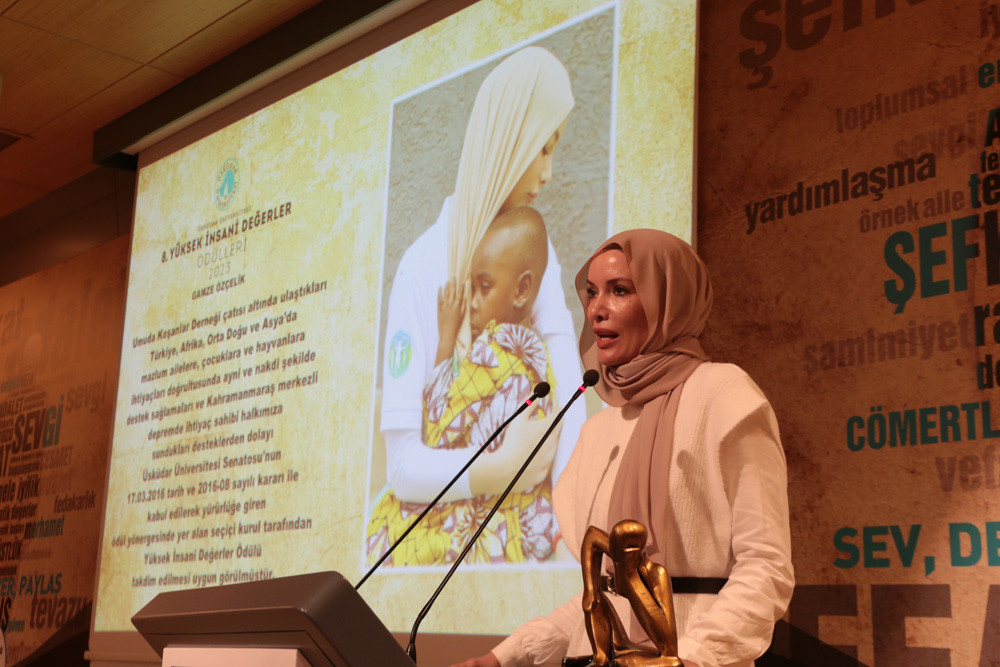 Törende son olarak 8. Yüksek İnsani Değerler Ödülü, Umuda Koşanlar Derneği çatısı altında ulaştıkları Türkiye, Afrika, Ortadoğu ve Asya’daki mazlum ailelere, çocuklara ve hayvanlara ihtiyaçları doğrultusunda ayni ve nakdi şekilde destek sağlamaları ve Kahramanmaraş merkezli deprem felaketinde ihtiyaç sahibi halkımıza sundukları desteklerden dolayı Dernek Başkanı Gamze Özçelik’e sunuldu. Gamze Özçelik’in ödülü de Üsküdar Üniversitesi Kurucu Rektörü, Yönetim Üst Kurulu Başkanı Prof. Dr. Nevzat Tarhan tarafından takdim edildi.