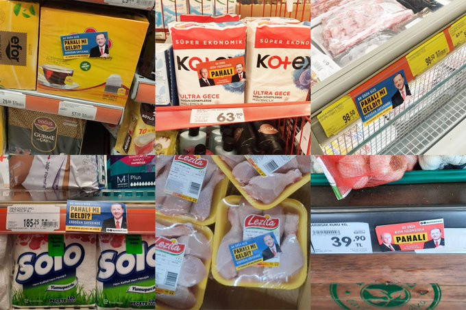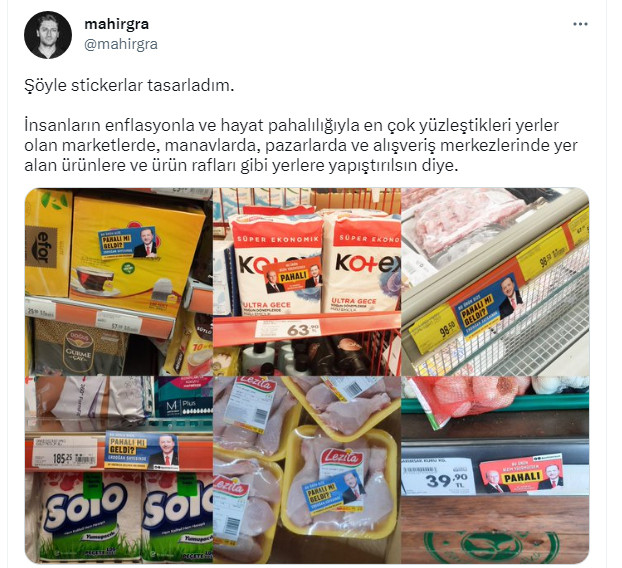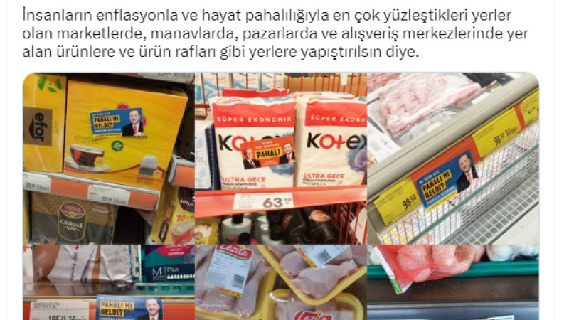 Marketlerde ürünlerin üzerine yapıştırılmaya başlanan "Bu ürün size pahalı mı geldi? Erdoğan sayesinde" çıka.rtmalarını hazırlayan görsel iletişim tasarımcısı Mahir Akkoyun, İzmir'de gözaltına alındı. Akkoyun, bu akşam saatlerinde serbest bırakıldı.