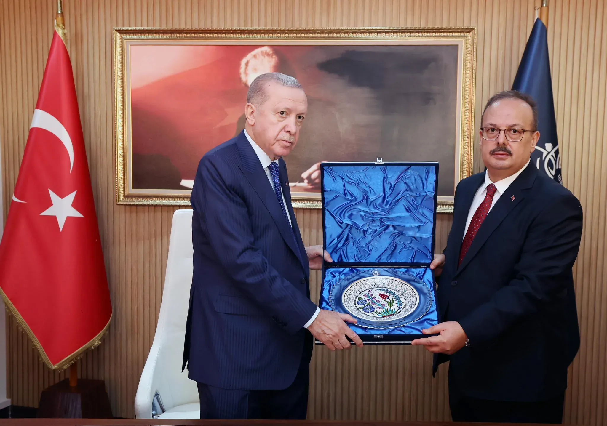 Cumhurbaşkanı Erdoğan daha sonra Başkan Çerçioğlu ve Vali Canbolat ile bir süre görüştü. Ziyaret sırasında Vali Canbolat tarafından Erdoğan’a hediye takdim edildi.