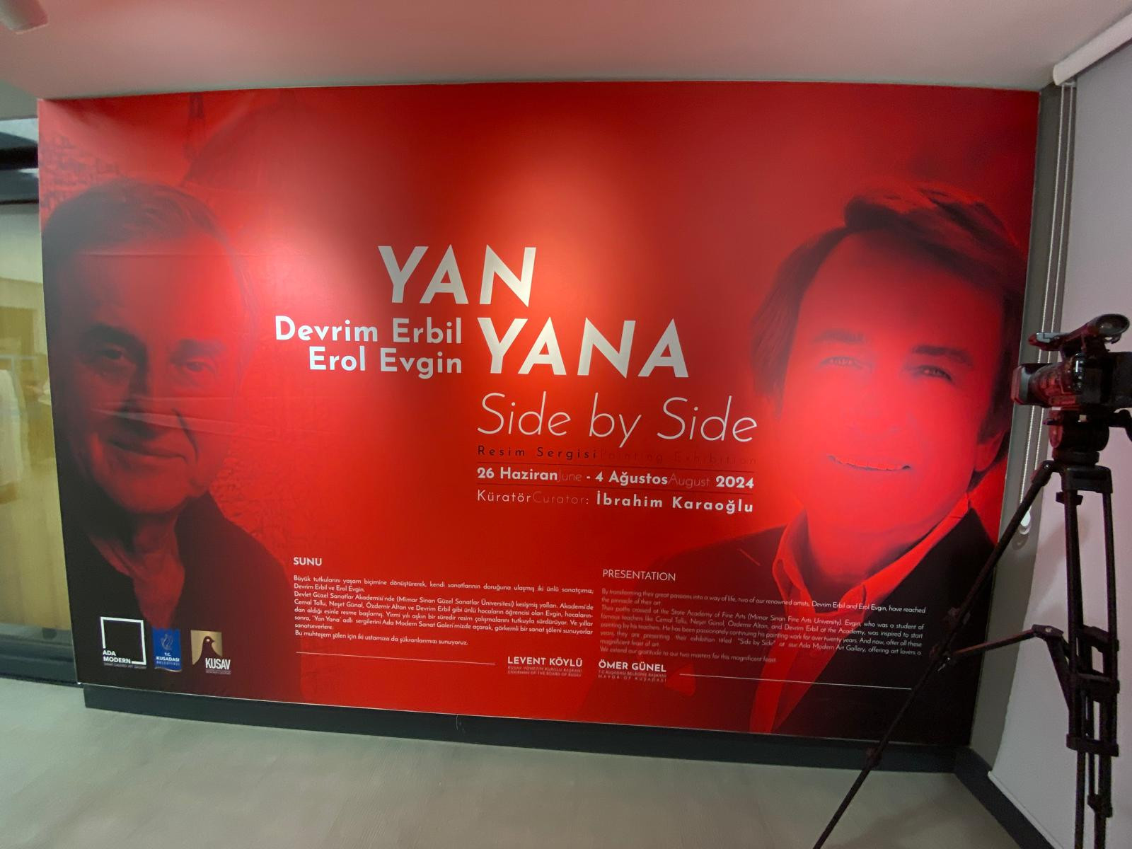 uşadası Belediye Başkanı Ömer Günel açılışta yaptığı konuşmada, "İki büyük ustamız Devrim Erbil ve Erol Evgin’in renkleri sanata dönüştürdüğü ve küratörlüğünü İbrahim Karaoğlu’nun gerçekleştirdiği “Yan Yana” isimli serginin açılışını Ada Modern Sanat Galerimizde gerçekleştirdik. Öğretmen-öğrenci olarak yolları Güzel Sanatlar Akademisi'nde kesişen iki büyük ustanın yıllardır tutkuyla sürdürdükleri çalışmalarını izleyeceğimiz sergiye 26 Haziran-4 Ağustos arası tüm sanatseverleri bekliyoruz" dedi.