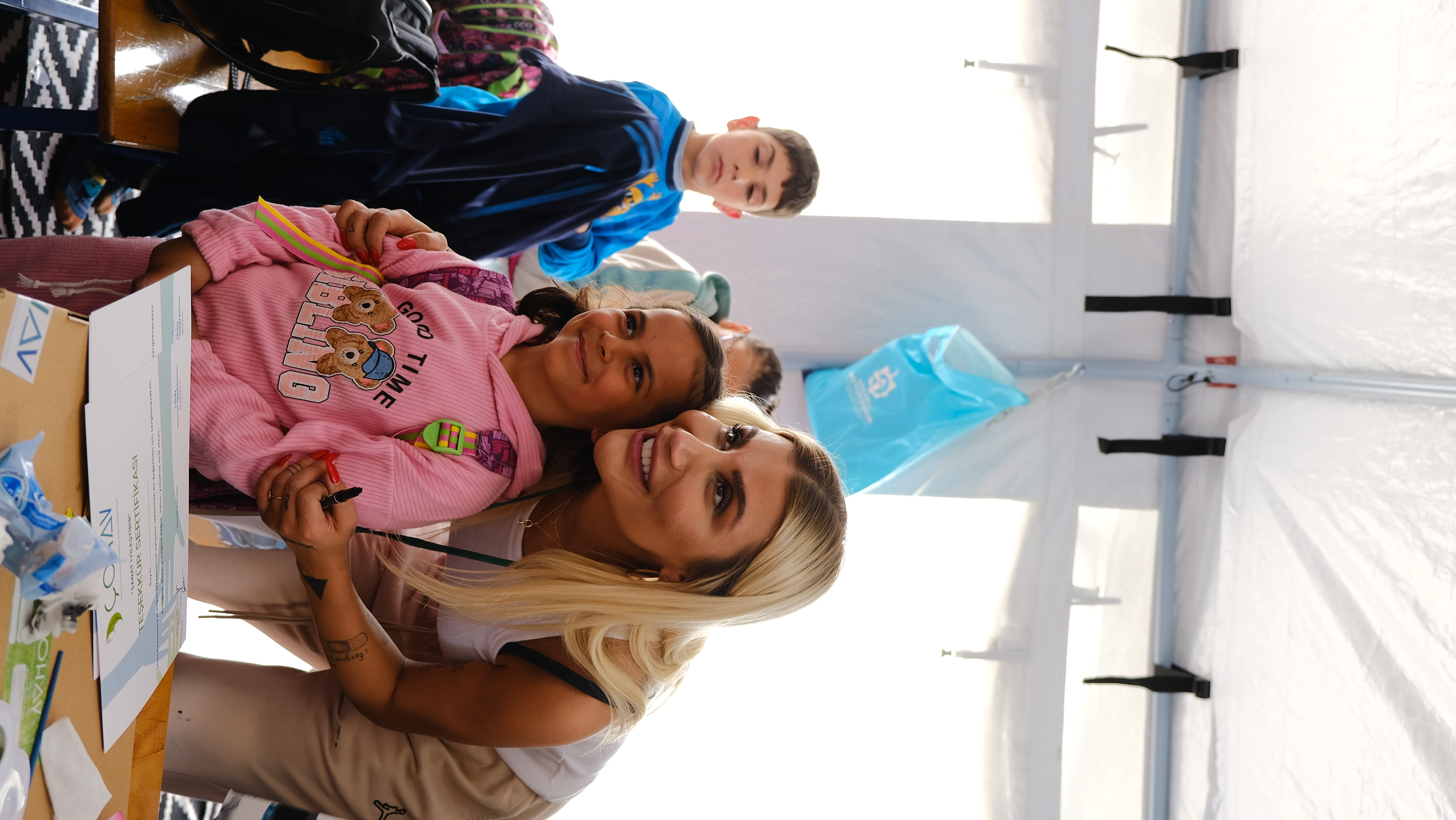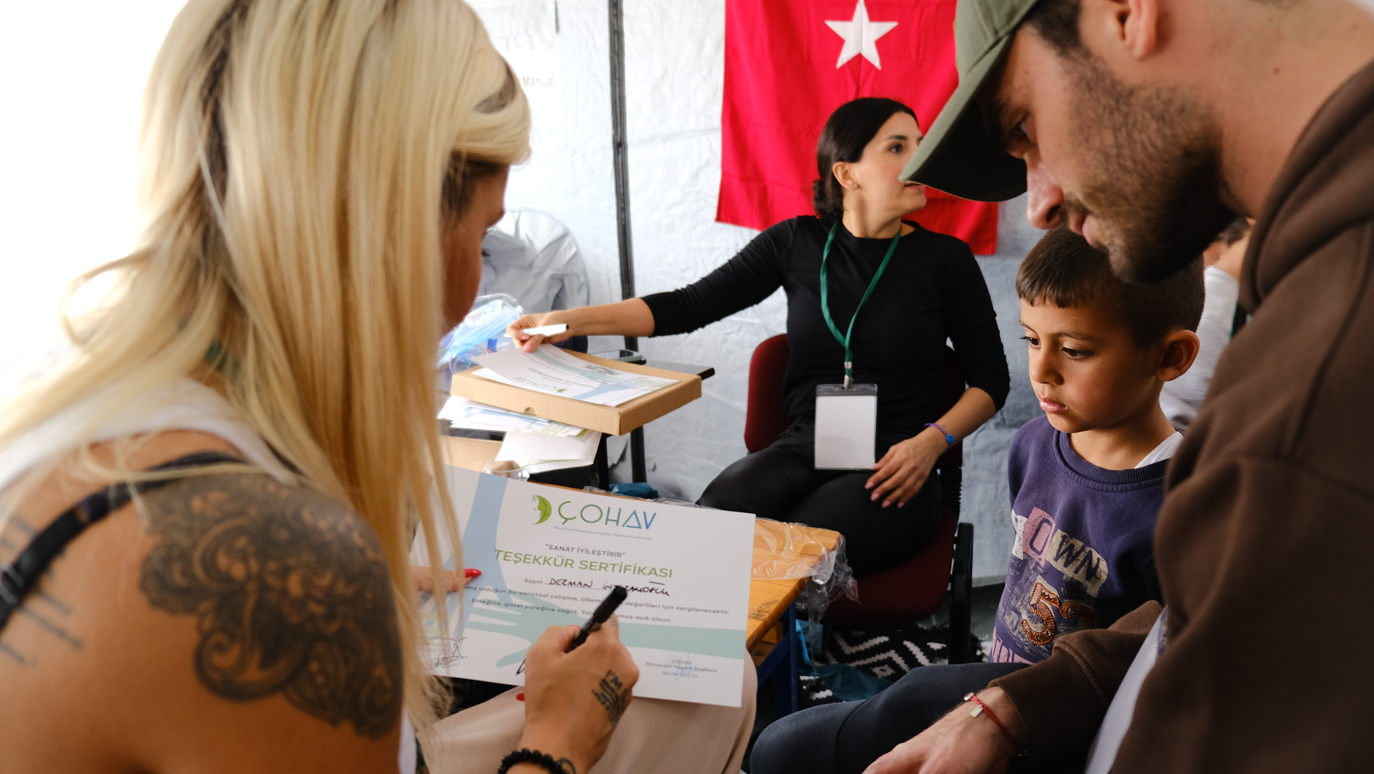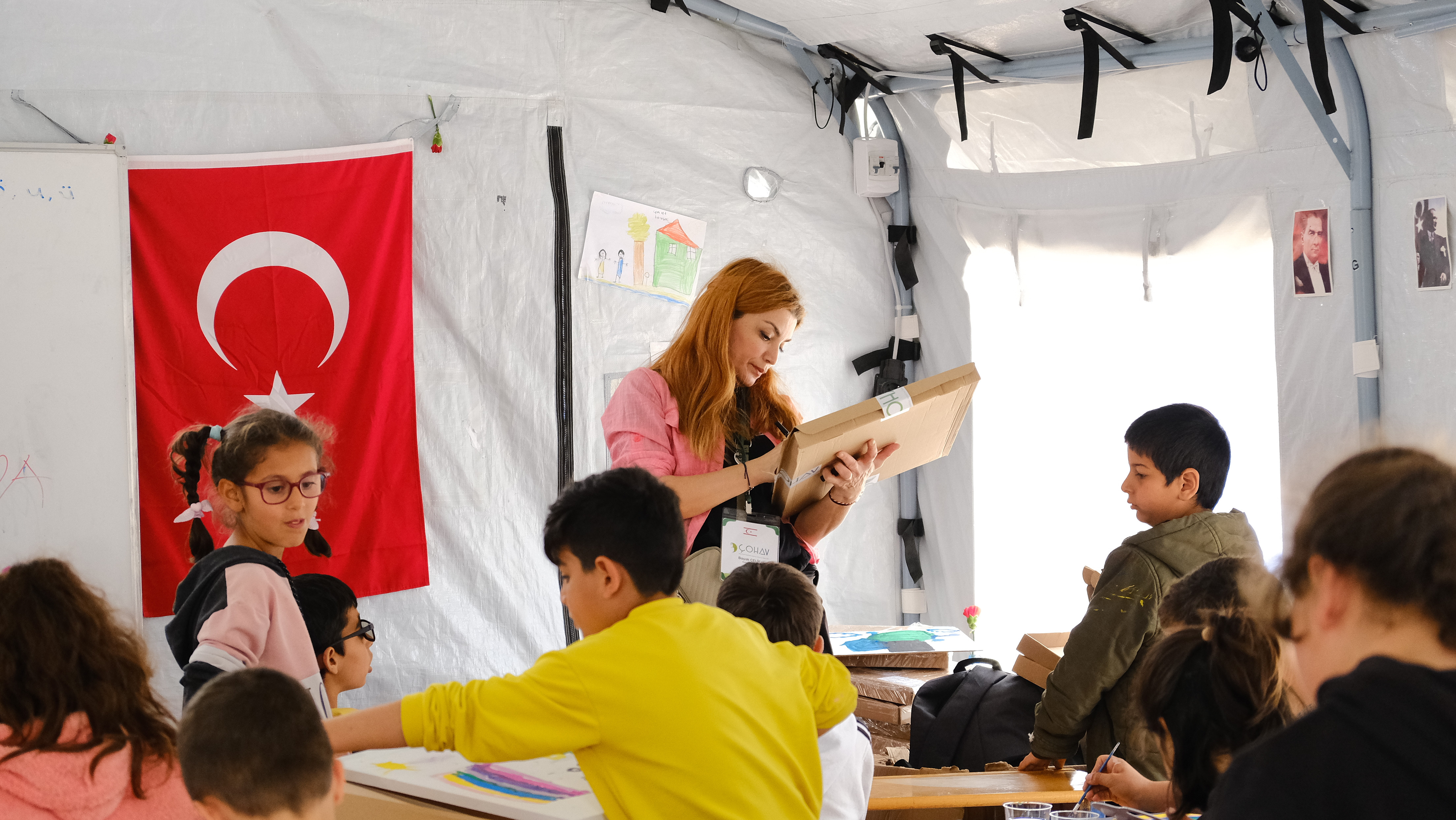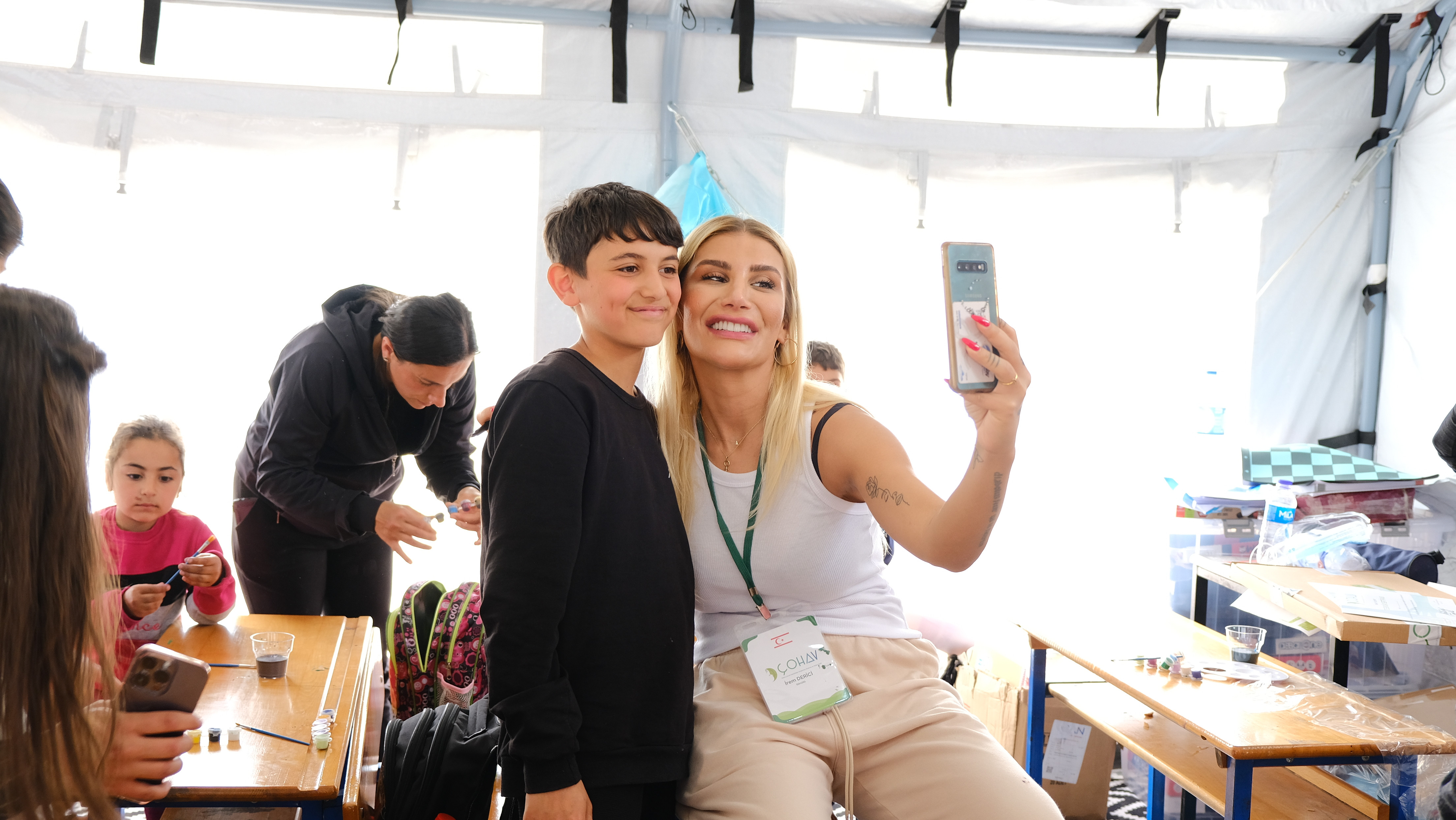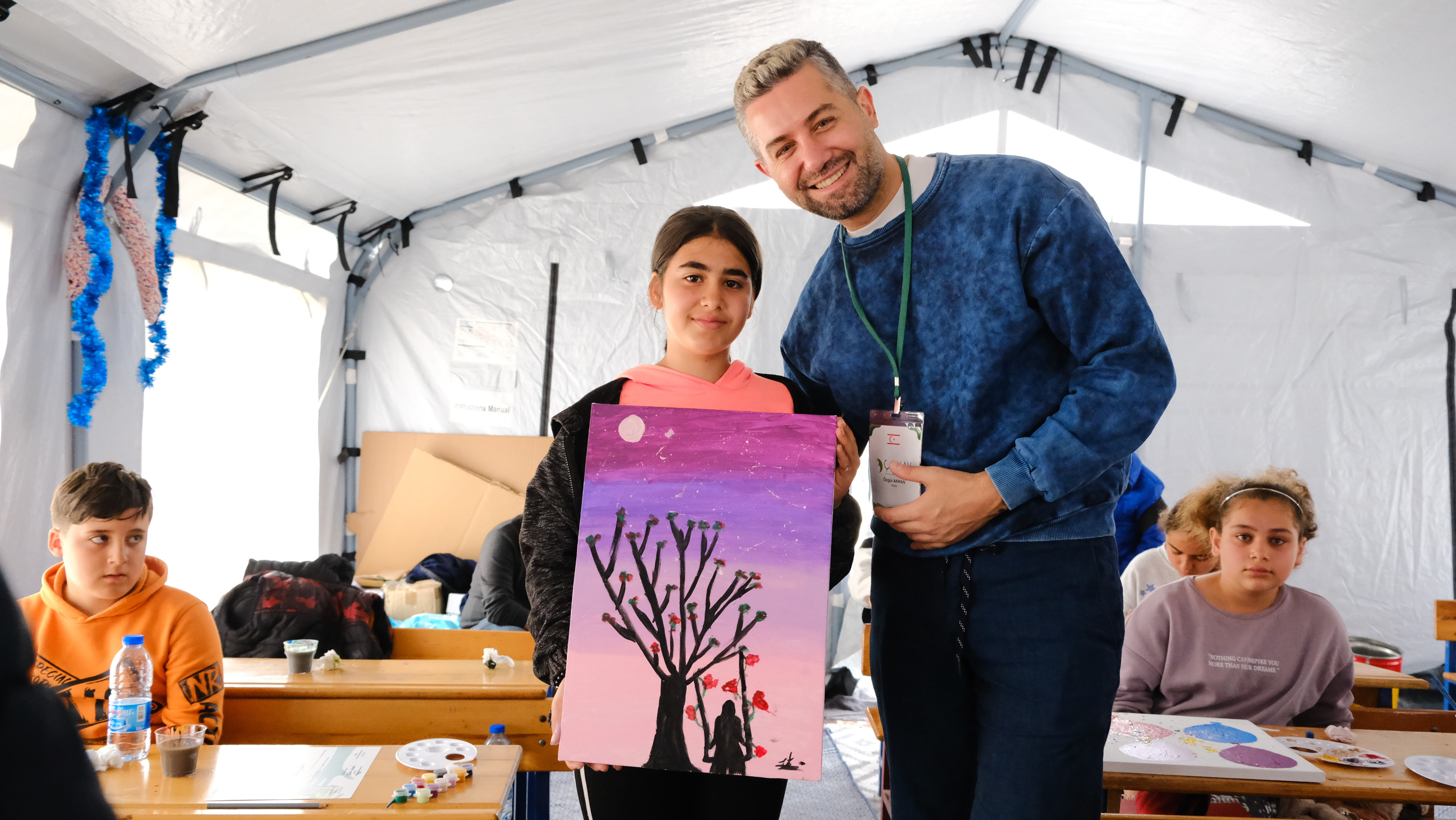 Yonca Evcimik, İrem Derici, Atakan Işıktutan ve Özgür Aras, depremden kurtulan çocuklara sanatla terapi etkinliği için Hatay’a gitti.