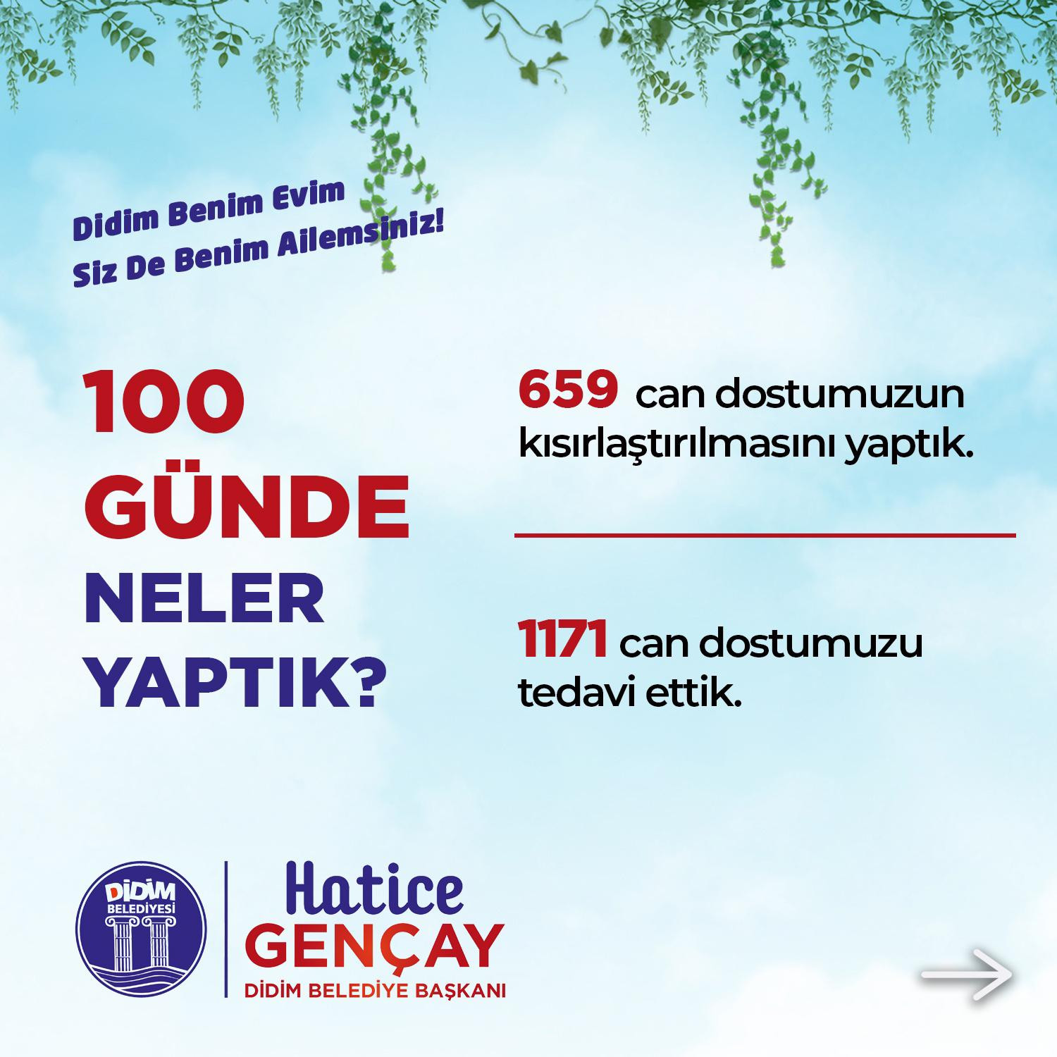 Denizi, kumu ve tarihi dokusu ile ülkemizin önde gelen turizm kentleri arasında yer alan Didim’de vatandaşların daha nezih ve modern bir ortamda yaşamaları için kolları sıvayan Didim Belediye Başkanı Hatice Gençay, ilk 100 günde, sağlık, çevre, yol yapımı, temizlik ve kültür sanat gibi birçok alanda önemli çalışmalar gerçekleştirdi.