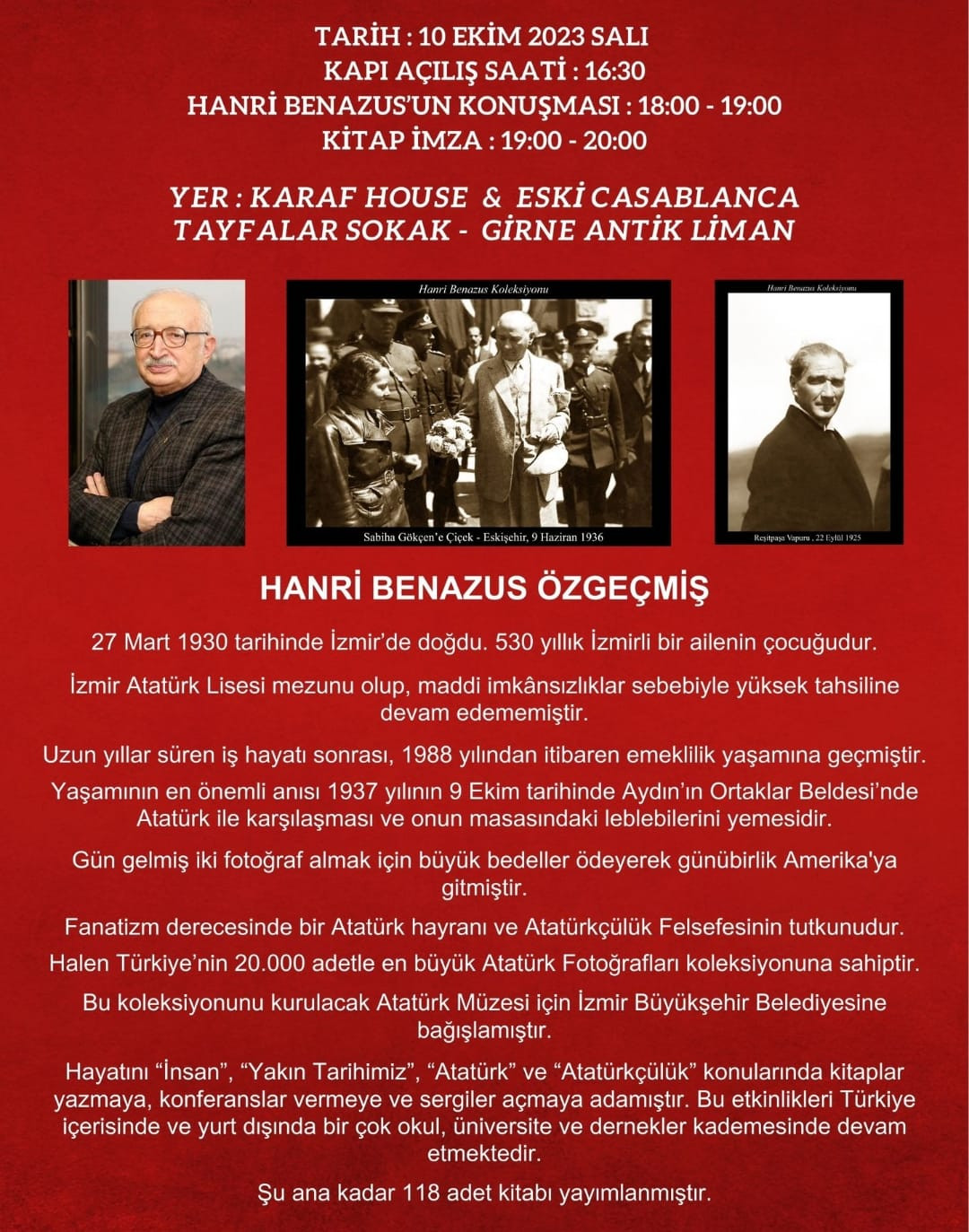 Atatürk’ü daha küçük yaşta tanımak onuruna erişen, hayranlığı tutkuya dönüşen, ömrünü Atatürk’ü ve O’nun hayalindeki Cumhuriyet’i anlatmaya adayan Atatürk fotoğrafları kolleksiyoneri Hanri Benazus Türkiye'de sonra şimdi de Kuzey Kıbrıs Türk Cumhuriyeti'nin Girne kentinde "Atatürk Fotoğrafları" sergileri açıyor.