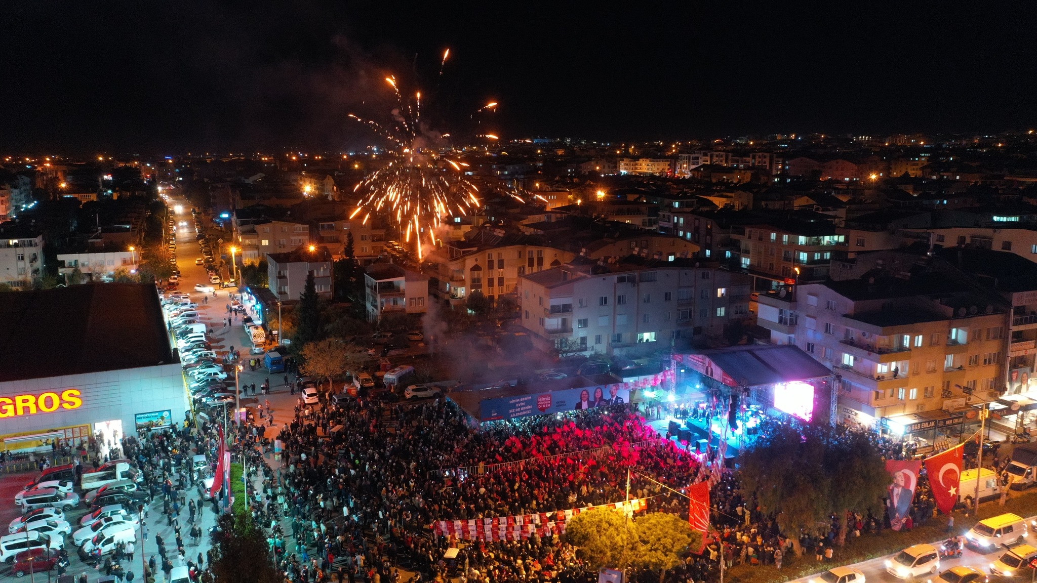 Seçim ofisinde toplanan binlerce partili 10. Yıl marşı, İzmir marşı ve seçim marşlarıyla coşkulu şekilde seçim zaferini kutladı.