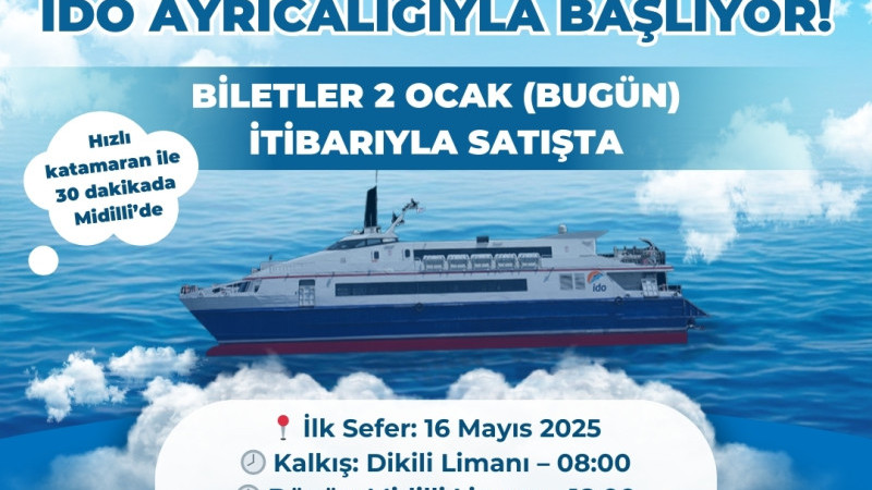 İlk sefer, 16 Mayıs 2025 Cuma günü saat 08.00’de Dikili Limanı’ndan hareket edecek, aynı gün saat 18.00’de Midilli Limanı’ndan dönüş gerçekleşecek. Hızlı katamaranlar sayesinde Dikili ile Midilli arasındaki ulaşım yalnızca 30 dakika sürecek. Vatandaşlar, 2 Ocak 2025 tarihinden itibaren www.ido.com.tr adresinden bilet satın alabilir ve sefer tarihleriyle ilgili detaylı bilgi alabilir.