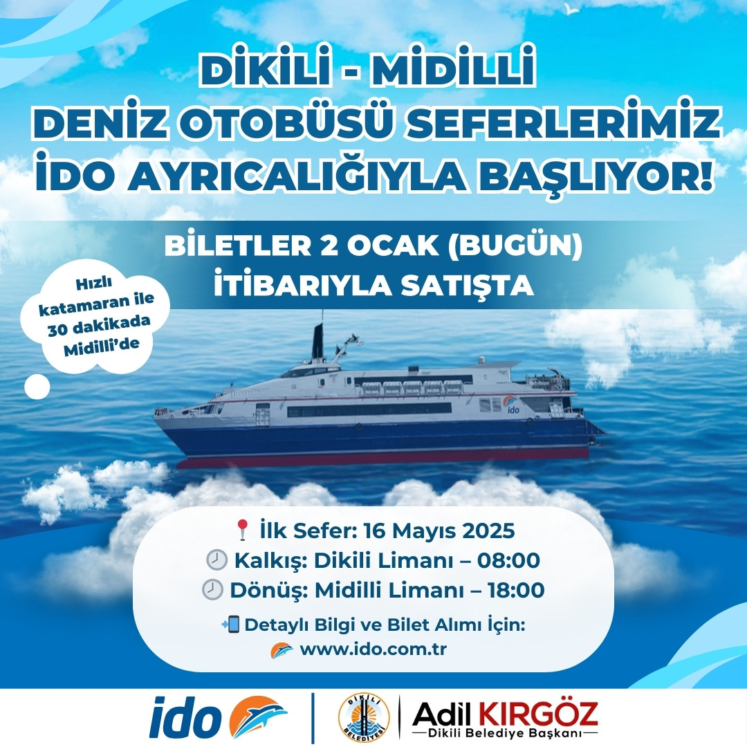 Dikili Belediye Başkanı Adil Kırgöz’ün girişimleri ve İstanbul Deniz Otobüsleri (İDO) iş birliğiyle Dikili-Midilli seferleri 16 Mayıs 2025 Cuma günü başlıyor.