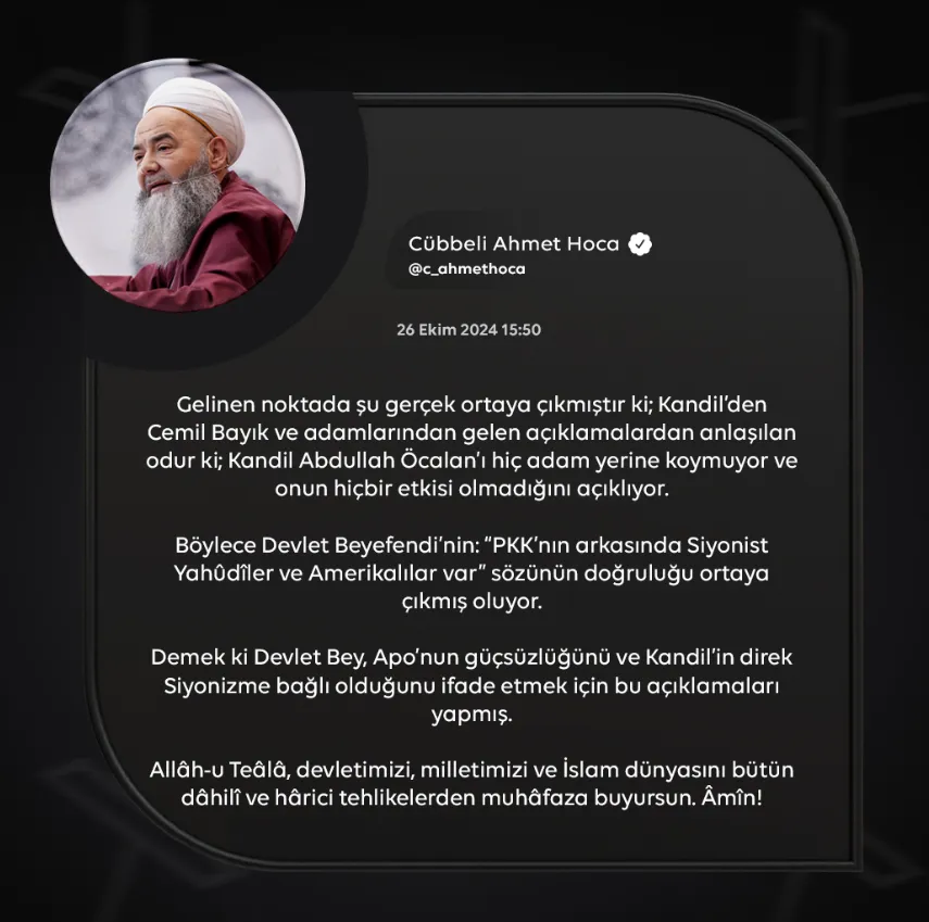 “Gelinen noktada şu gerçek ortaya çıkmıştır ki, Kandil’den Cemil Bayık ve adamlarının yaptığı açıklamalardan anlaşılan, Kandil’in Abdullah Öcalan’a hiçbir değer vermediğidir. Böylece Devlet Bey’in ‘PKK’nın arkasında Siyonist Yahudiler ve Amerikalılar var’ sözünün doğruluğu ortaya çıkıyor. Allâh-u Teâlâ, devletimizi, milletimizi ve İslam dünyasını bütün iç ve dış tehlikelerden muhafaza etsin.”