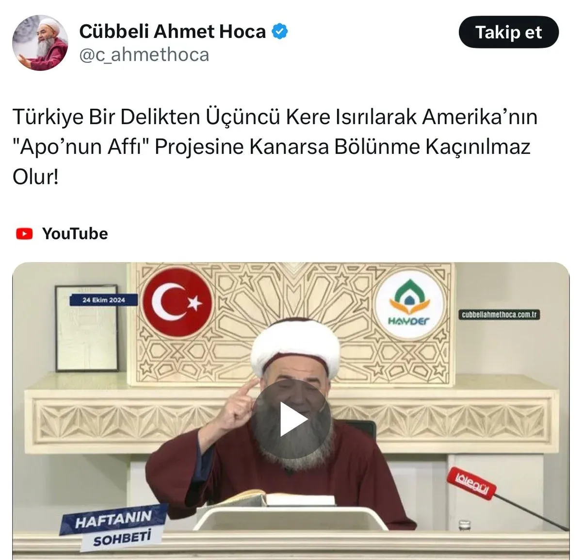 Bahçeli'nin terör örgütü elebaşı Öcalan için yaptığı bu çıkışın ardından İsmailağa tarikatına yakın Ahmet Mahmut Ünlü, "Türkiye bir delikten üçüncü kere ısırılarak Amerika'nın "Apo'nun affı" projesine kanarsa bölünme kaçınılmaz olur!" ifadelerini kullandı. Ünlü. Çakıcı ziyaretinin ardından birden şu paylaşımı yaptı: