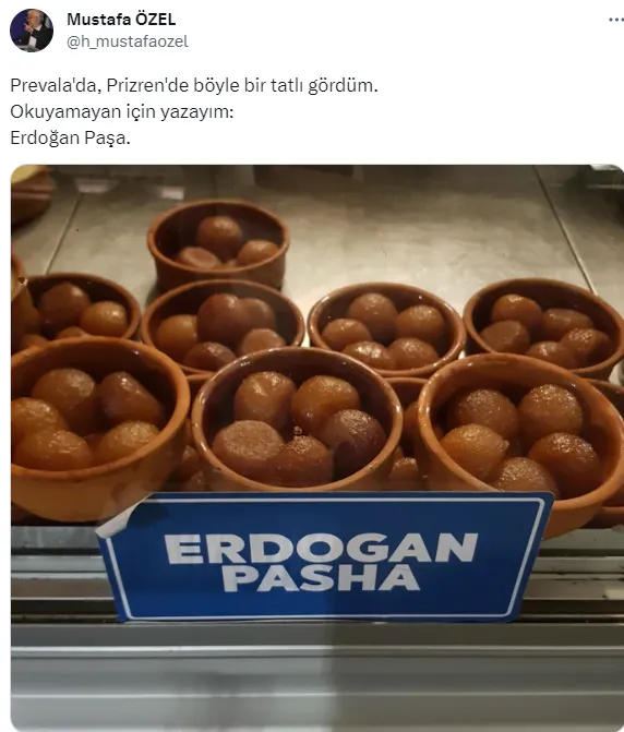 İnsicam Dergisi Genel Yayın Yönetmeni Mustafa Özel, Kosova’da bir tatlıcının tezgahını paylaştı. Prevala ve Prizren’de Kemalpaşa tatlısının ‘Erdoğan Paşa’ olarak satıldığını belirtti.