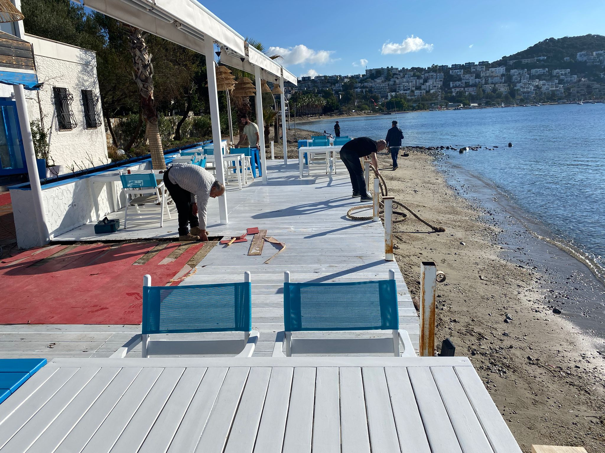 Belediye ekiplerinin müdahalesi sonucu, Bitez sahilde kıyı işgaline sebep olan ahşap platform sökülüyor
