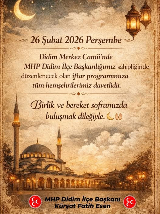 İlçe Başkanı Kürşat Fatih Esen tarafından yapılan duyuruda, iftar programının MHP Didim İlçe Başkanlığı ev sahipliğinde düzenleneceği belirtilerek, tüm Didim halkı davet edildi.
