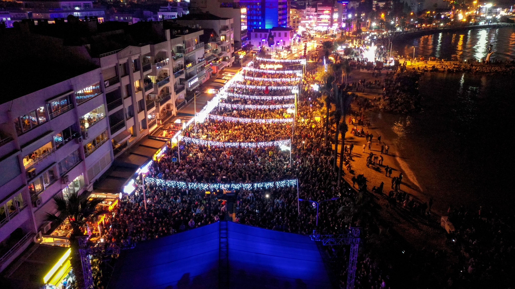 Kuşadası’nda yaşayan ve yılbaşına Kuşadası’nda girmek isteyen binlerce kişi Atatürk Bulvarı’nda kurulan sahnenin bulunduğu alana akın etti. Çocuklar, İsmail Cem Dostluk ve Barış Meydanı’nda kendileri için düzenlenen oyun alanlarında gönüllerince vakit geçirirken aileleri de müzik yayınları ile eğlendi.