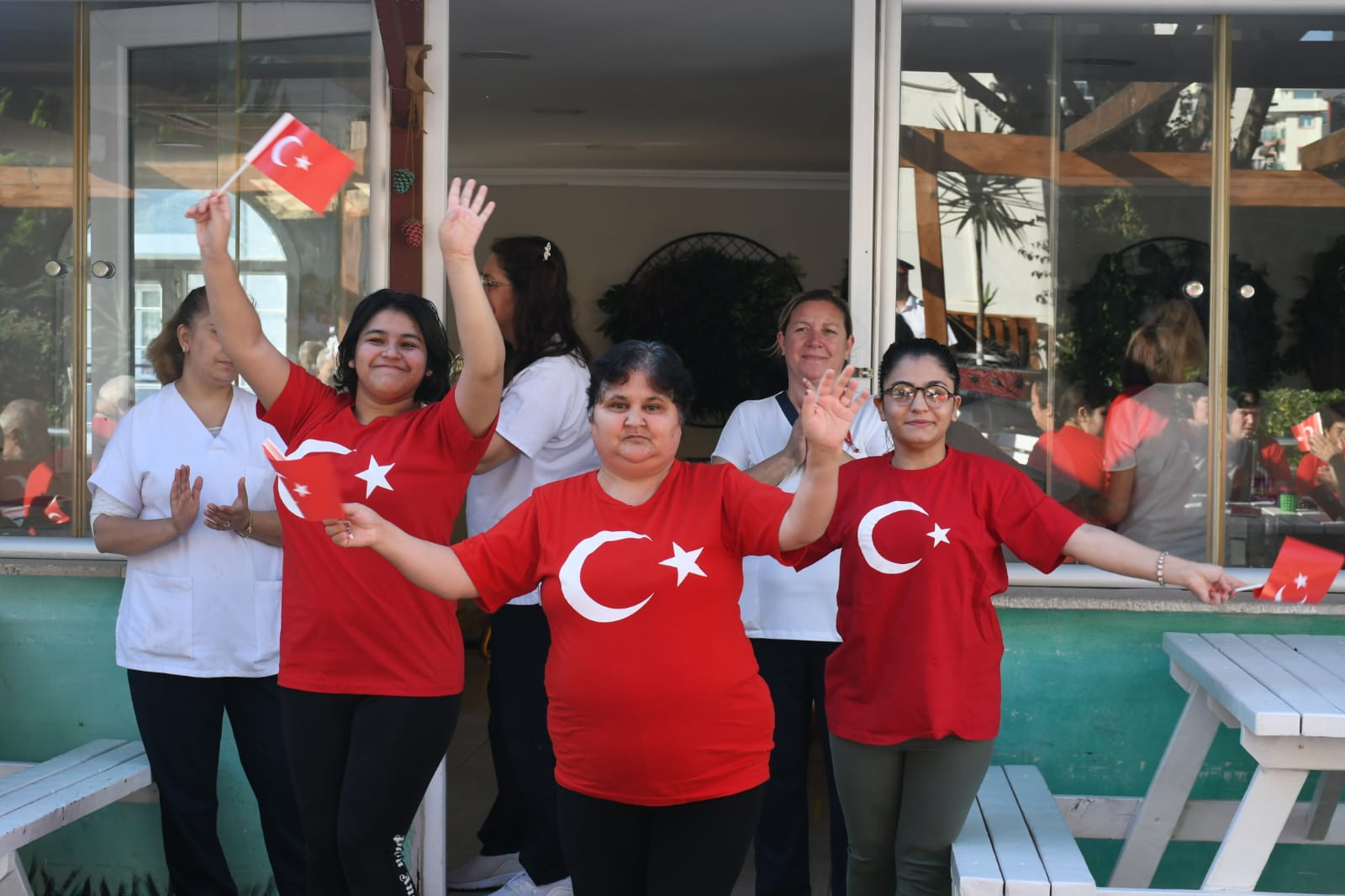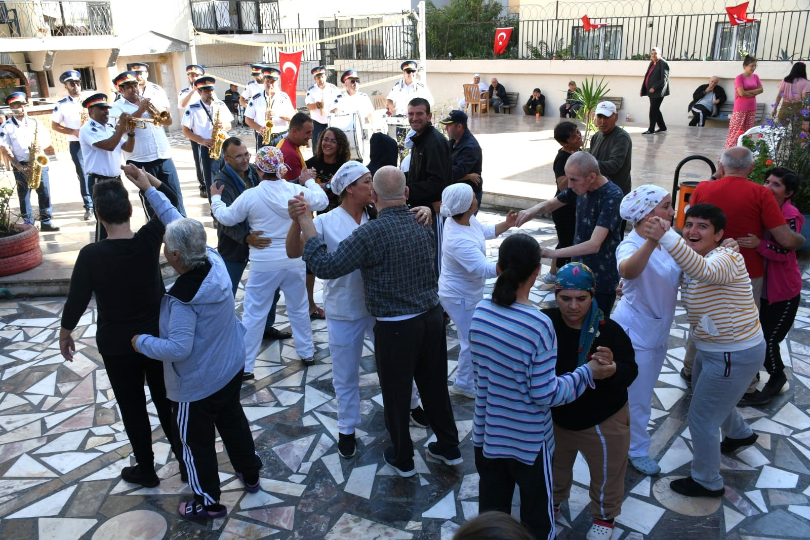 Bandoyu bir anda karşılarında gören bakımevi sakinleri ve çalışanları önce şaşırdı. Ardından bandonun çaldığı marşlar ve hareketli parçalara eşlik etmeye başladı. Giydikleri ay-yıldızlı tişörtler ve ellerindeki Türk bayraklarıyla renkli görüntüler oluşturan bakımevi sakinleri, Cumhuriyet Bayramı coşkusunu gönüllerince yaşadı.