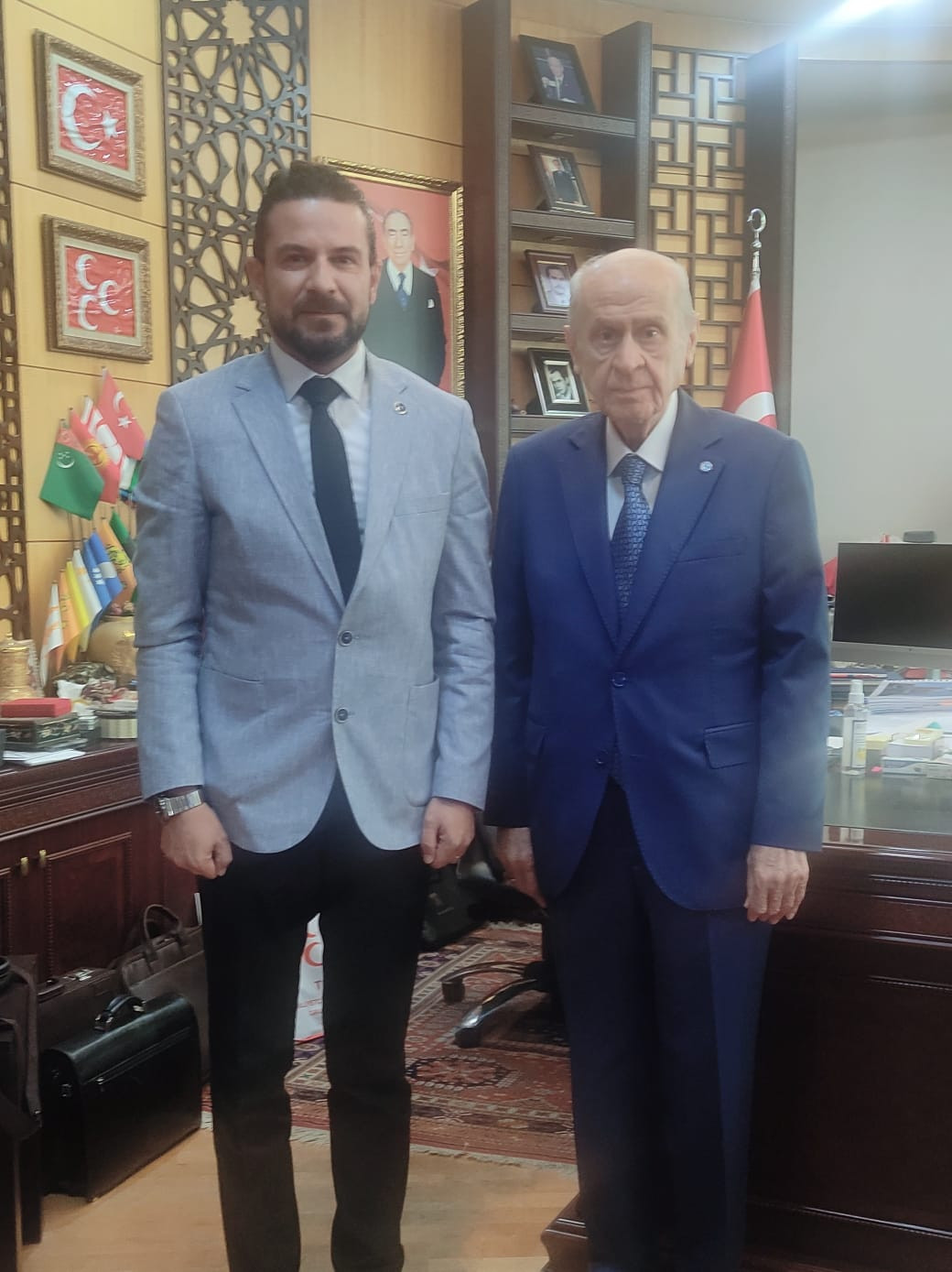 MHP Aydın İl Başkanı Haluk Alıcık öncülüğünde gerçekleşen ziyarette, MHP Didim Belediye Meclis üyesi Emrah Irsık, MHP Lideri Devlet Bahçeli’yi makamında ziyaret etti.