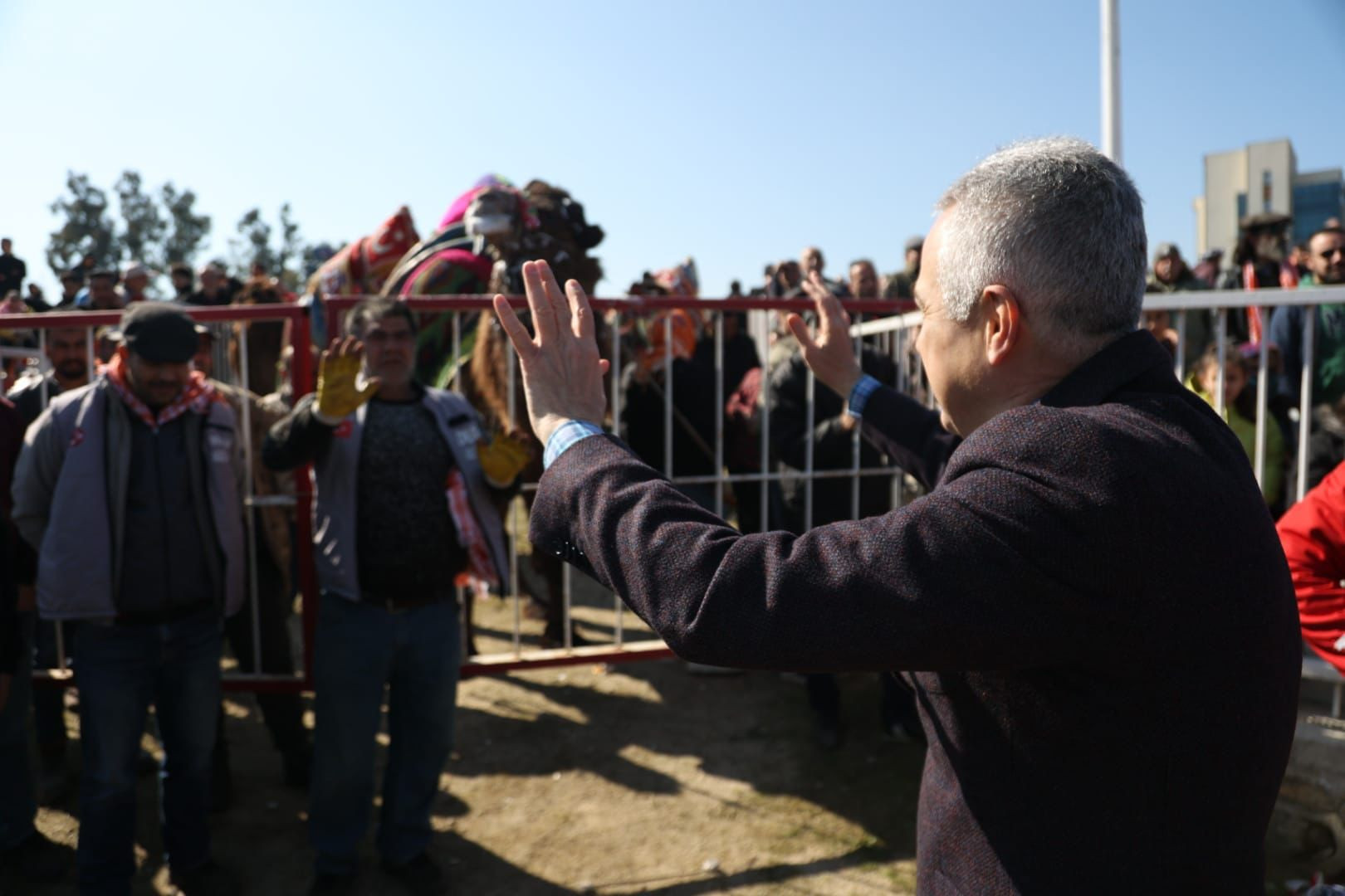 Nazilli'de düzenlenen 14. Geleneksel Deve Güreşi'ne katılan Cumhur İttifakı Aydın Büyükşehir Belediye Başkanı Adayı Mustafa Savaş, vatandaşlara yağlık dağıttı.