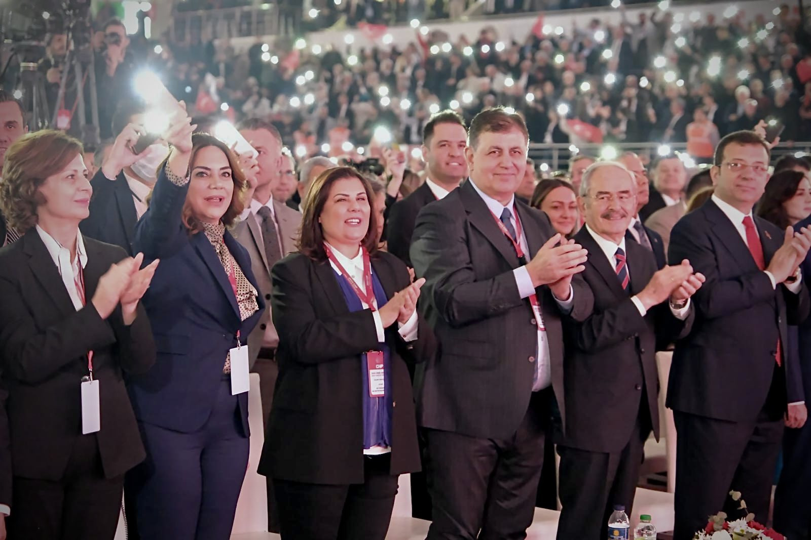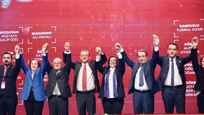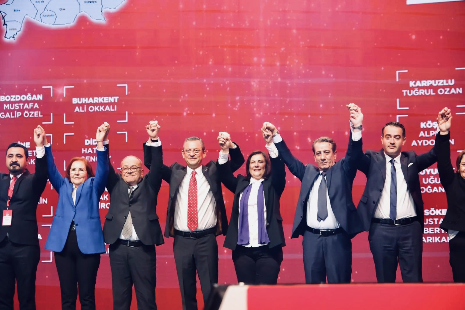 Toplantının sonunda Özel, sırayla sahneye davet edilen belediye başkan adayları ile el ele tutuşarak, partilileri selamladı.
