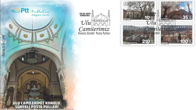 İSTANBUL (İGFA) - PTT AŞ, 28 Şubat 2025 tarihinde "Ulu Camilerimiz" konulu 10 TL, 35 TL, 100 TL ve 210 TL (26 x 36 mm boyutunda) bedelli sürekli posta pulları ile söz konusu pullara ait 390 TL bedelli ilkgün zarfını abone sayısı kadar PTT iş yerlerinde ve PTT AŞ’ye ait www.filateli.gov.tr web adresinde satışa sundu.