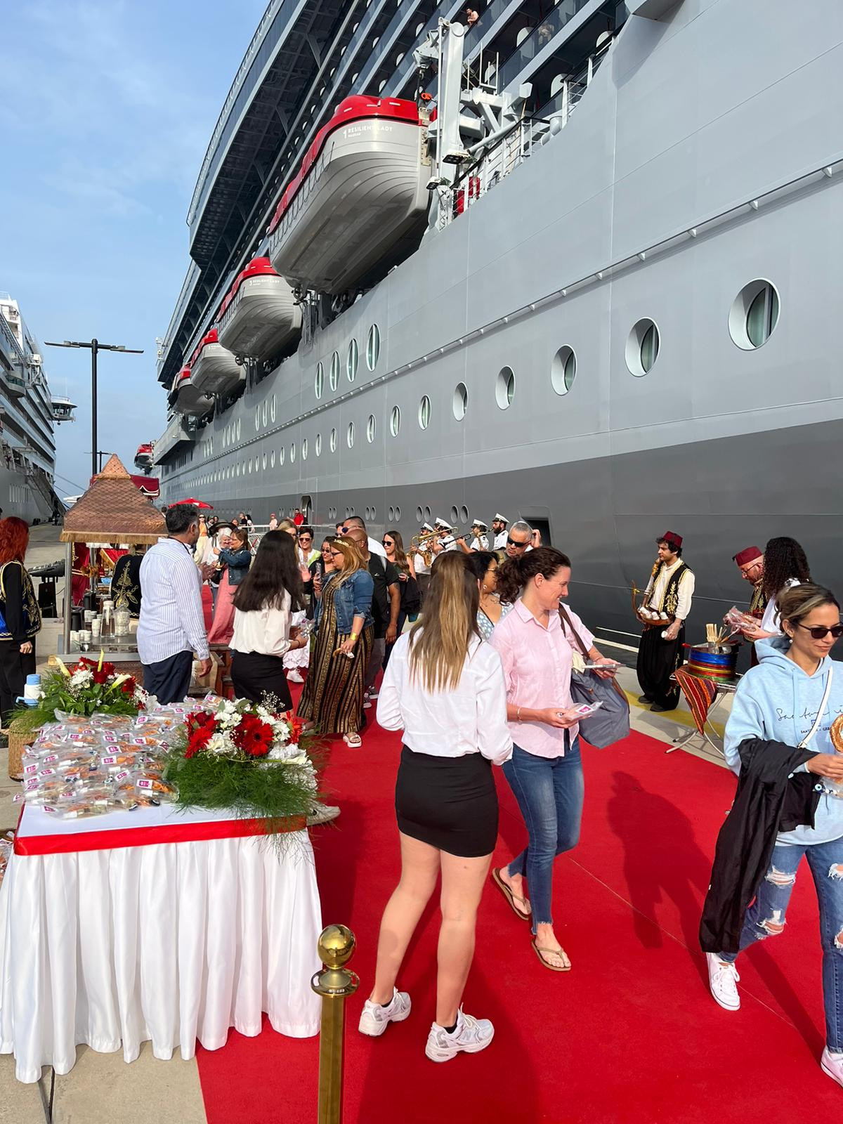 Resilient Lady’nin Bodrum Cruise Port’a gerçekleştirdiği ilk sefer için limanda hazırlanan törende misafirler, bando takımı, Bodrum’a özel minik hediyeler, Türk kahvesi ve maraş dondurması ikramlarıyla karşılandı. 11 Mayıs Perşembe günü saat 07:00’de Santorini Limanı’ndan Bodrum Cruise Port’a gelen Bahamalar bayraklı Resilient Lady, akşam 20.00 civarında Pire Limanı’na doğru hareket edecek. Gemide ağırlıklı olarak Amerikalı, İngiliz uyruklu toplam 1444 yolcu ve 1096 personel bulunuyor.