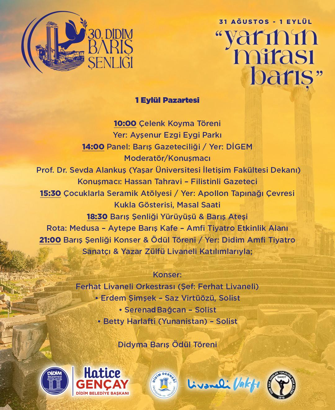 “Yarının mirası; barış’ temasıyla gerçekleşecek 30. Didim Barış Şenliği, geçmişten geleceğe uzanan barış ve kardeşlik değerlerini yaşatmayı amaçlamaktadır.