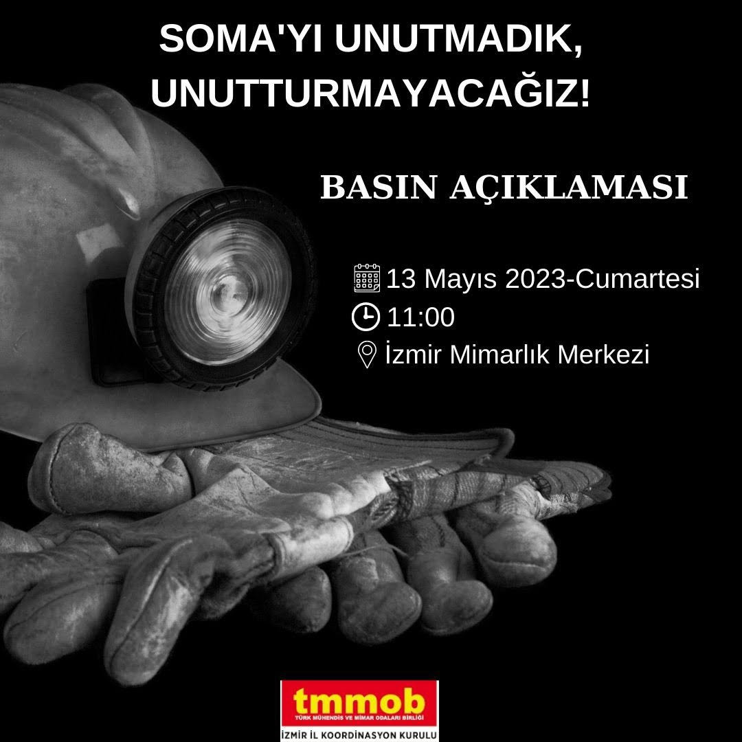 Soma Faciasının 9.yılında TMMOB İzmir İl Koordinasyon Kurulu tarafından 13 Mayıs 2023 cumartesi günü saat 11:00'de İzmir Mimarlık Merkezi'nde basın açıklaması gerçekleştirilecektir.