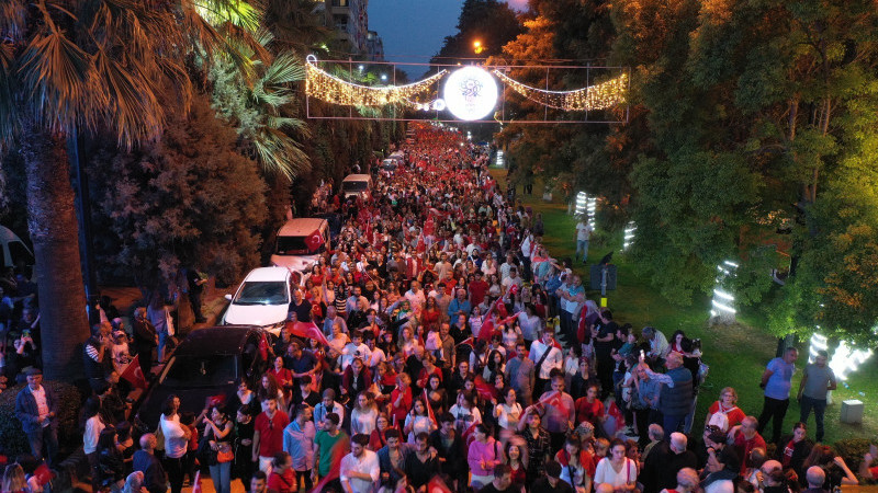 Atatürk Kent Meydanı’ndan başlayarak Adnan Menderes Bulvarı boyunca devam eden korteje, on binlerce vatandaş Türk bayraklarıyla katıldı.