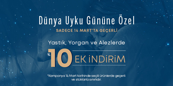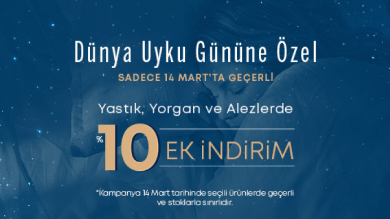 Bu yıl 14 Mart’ta kutlanacak Dünya Uyku Günü'nde seçili Yataş mağazaları, misafirlerini gece 24.00'e kadar ağırlayacak. Ayrıca belirli Yataş yataklarda %10’a varan ve seçili yastık, yorgan, alez ürünlerinde ise ek %10 indirim fırsatı sunulacak.