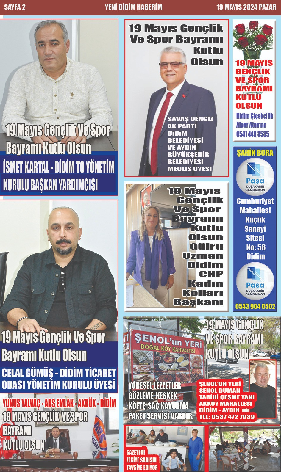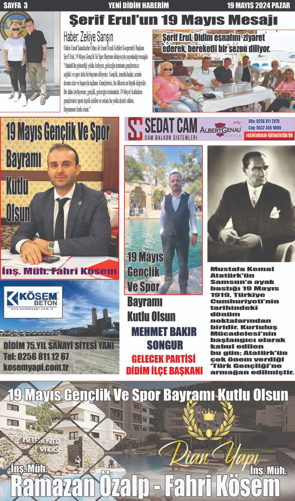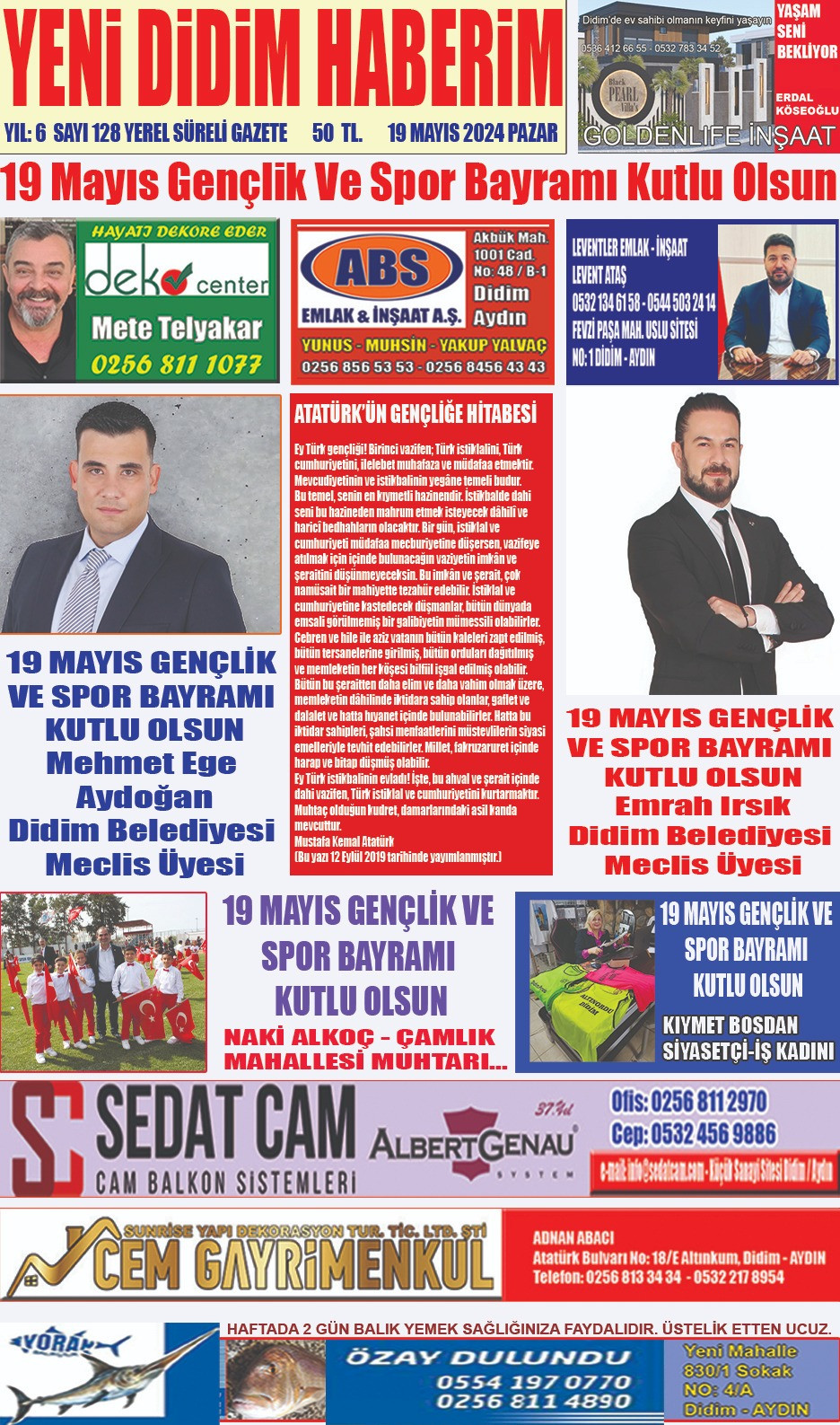Yeni Didim Haberim Gazetesi 19 Mayıs Sayısı Çıktı. Kutlama mesajı yayınlayanlara ve reklam verenlere teşekkür ederiz.