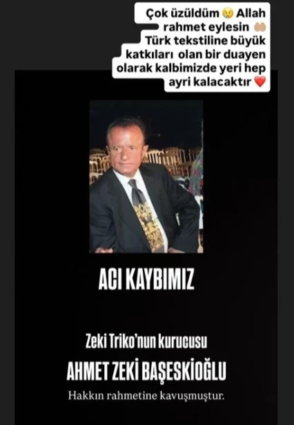 Ünlü model Tülin Şahin ise paylaşımında, “Türk tekstiline büyük katkıları olan bir duayen olarak kalbimizde yeri hep ayrı kalacaktır” ifadeleriyle üzüntüsünü dile getirdi.