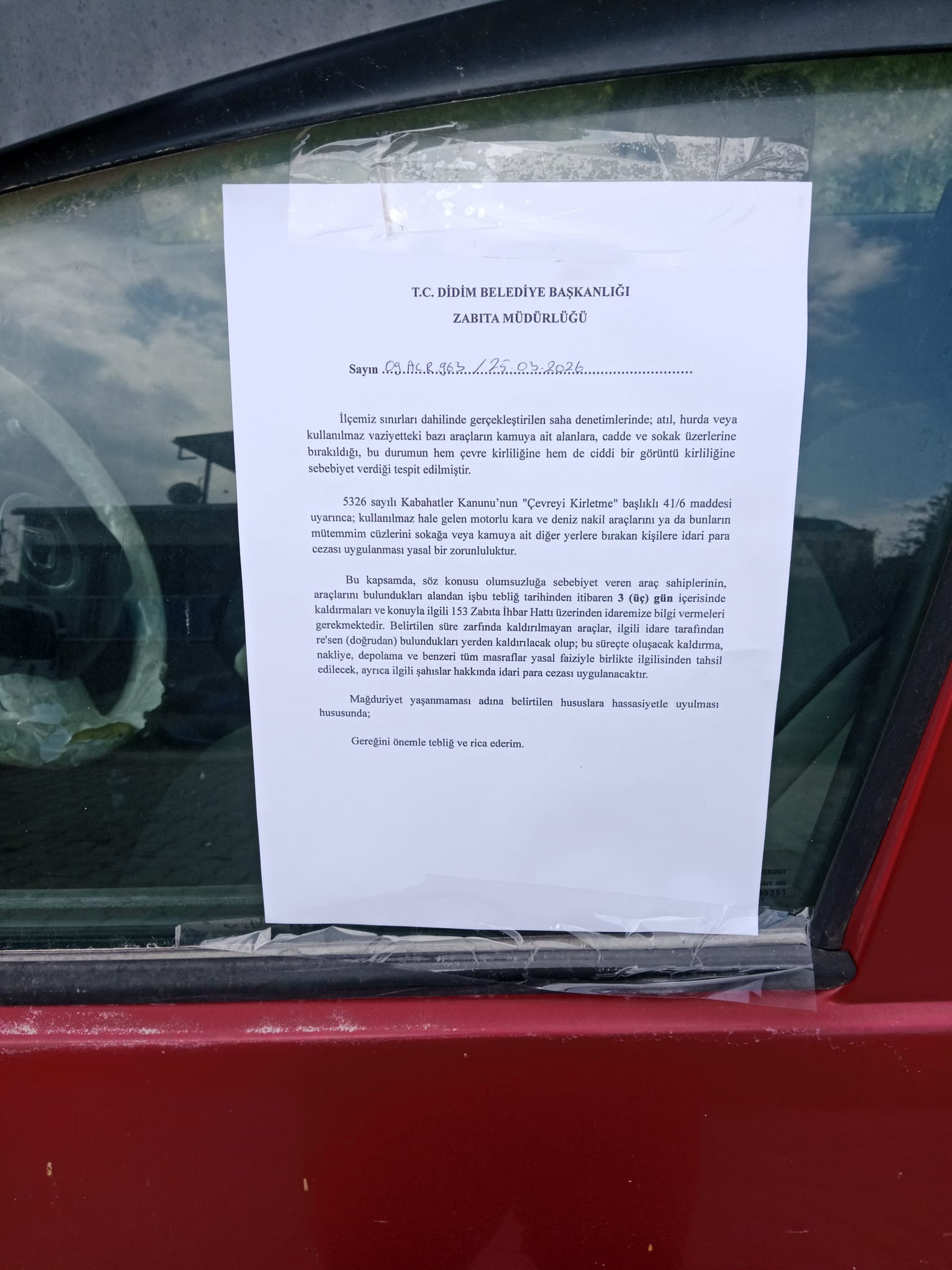 Didim’de kamuya ait alanlara bırakılan atıl ve kullanılmaz araçlara yönelik denetimler sıkılaştırıldı. Didim Belediyesi Zabıta Müdürlüğü ekipleri, çevre ve görüntü kirliliğine neden olan araçlar için araç sahiplerine resmi tebligat bırakmaya başladı.