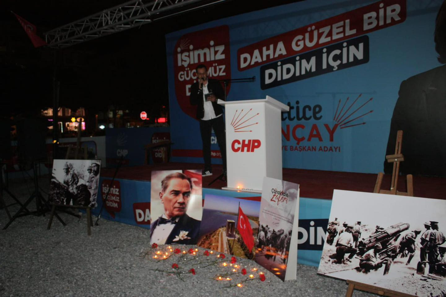 Bu arada, 18 Mart akşamı CHP Didim seçim ofisinde Çanakkale şehitlerimiz için anma gecesi düzenlendi. Aşkın Atlı başkanlığında CHP Didim ilçe teşkilatı, CHP Kadın Kolları Başkanı Gülru Pere Uzman, CHP Gençlik Kolları Başkanı Süleyman Çulha, CHP belediye başkan adayı Hatice Gençay ve meclis üyeleri geceye katıldı. Gecenin sonunda sahnede kurulan sembolik anıta kırmızı karanfiller bırakıldı.