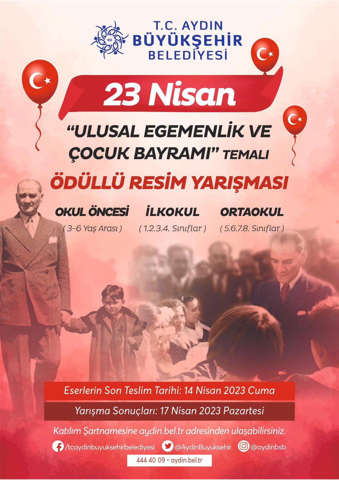 Büyükşehir Belediyesi’nin düzenleyecek olduğu yarışmaya; Okul Öncesi, İlkokul ve Ortaokul öğrencileri katılabilecek. Çocuklar, Ulu Önder Mustafa Kemal Atatürk tarafından kendilerine armağan edilen bu özel günde yeteneklerini ortaya koyacaklar. Yarışma sonuçları 17 Nisan tarihinde www.aydın.bel.tr web adresinden duyurulacak.