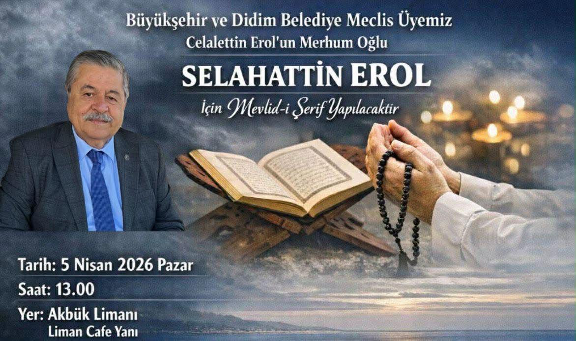 5 Nisan 2026 Pazar günü, saat 13.00’te Akbük Limanı’nda, Liman Cafe yanında Selahattin Erol için Mevlid-i Şerif okunacak.